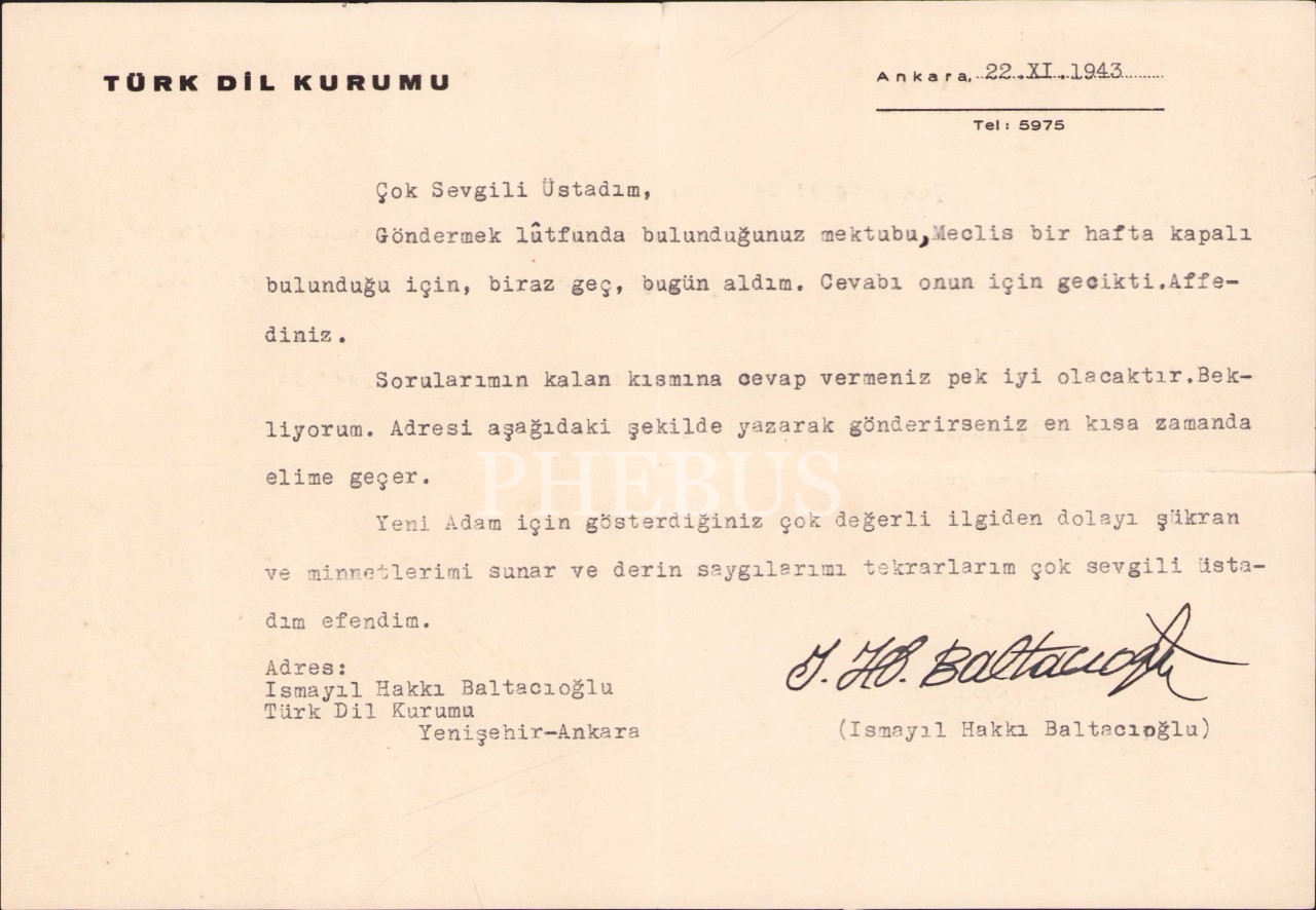 Türk Dil Kurumu antetli, İsmayıl Hakkı Baltacıoğlu imzalı mektup, Ankara 1943, 17x24 cm
