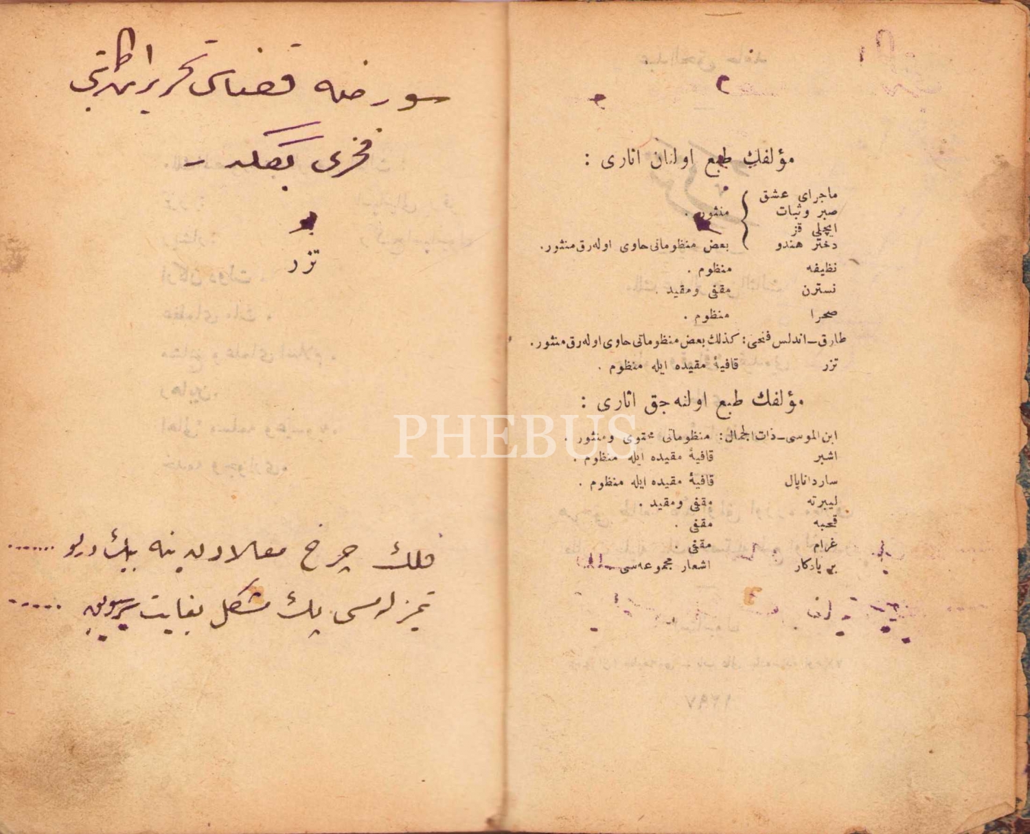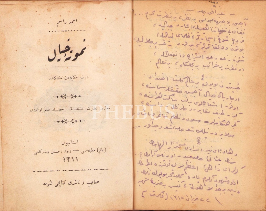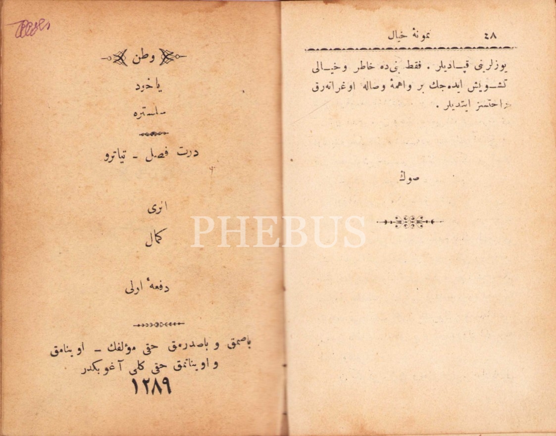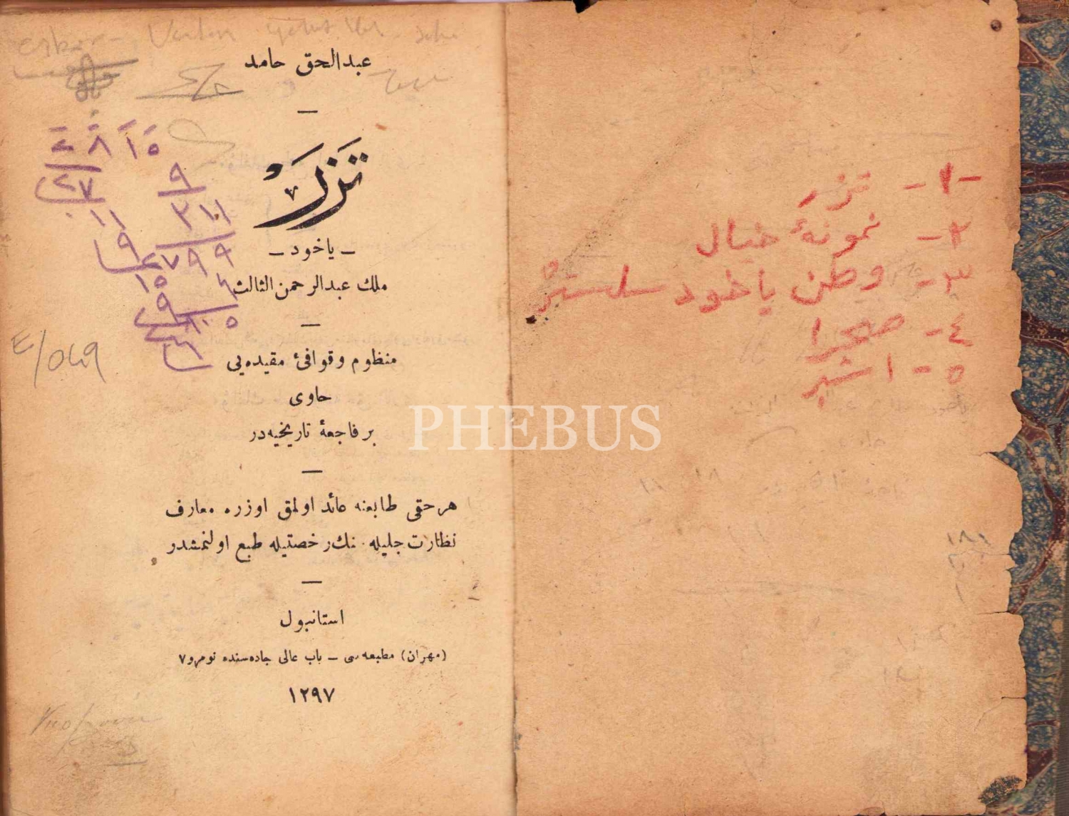 Osmanlıca 5 kitap tek ciltte: Tezer Yâhud Melik Abdurrahman-ı Sâlis, Abdulhak Hâmid, Mihran Matbaası, İstanbul 1297, 127 syf.; Numûne-i Hayâl, Ahmed Râsim, Alim Matbaası, İstanbul 1311, 48 syf.; Vatan Yâhud Silistre [İlk kez], Namık Kemal, 1289, 168 syf.;