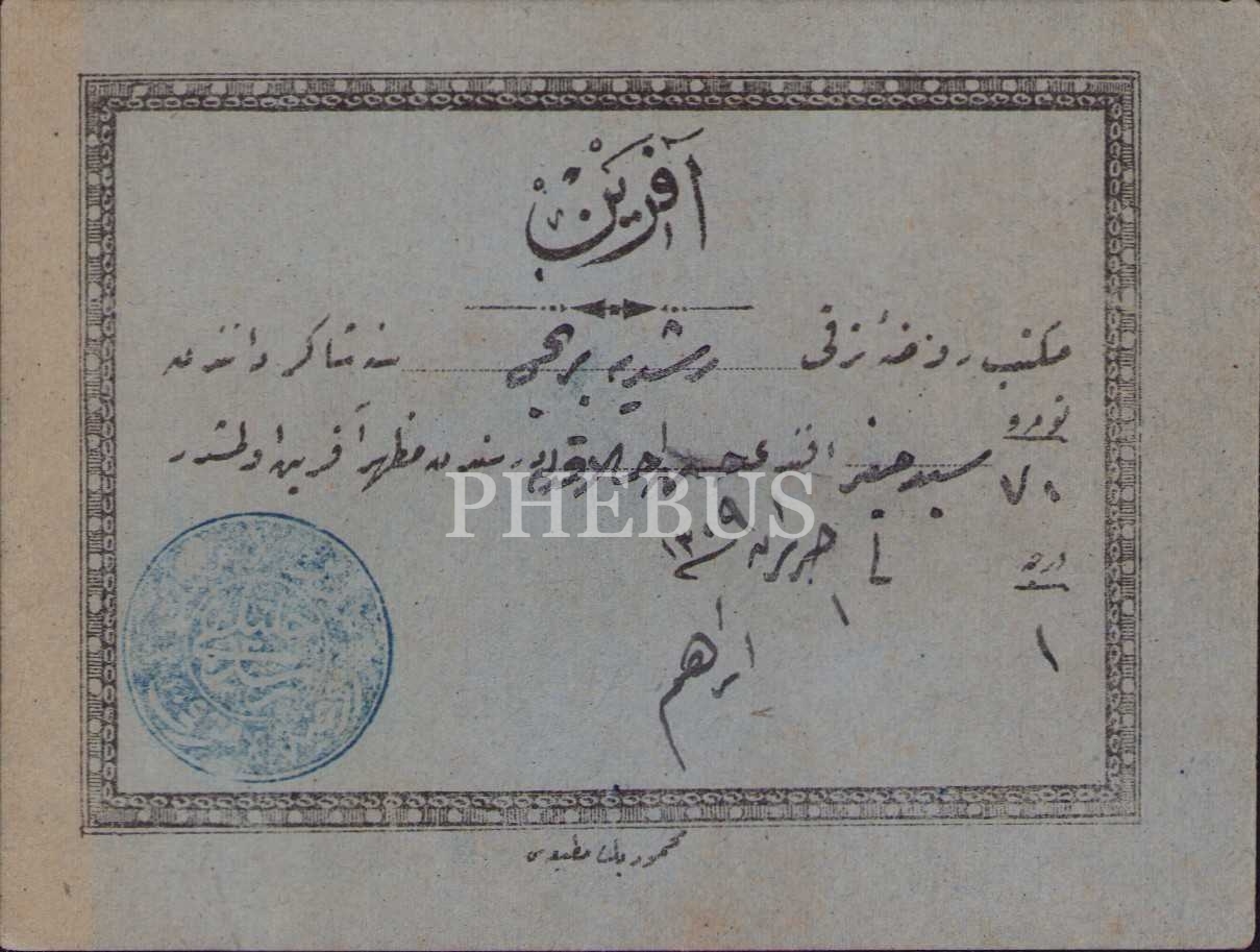 Osmanlıca Aferin kağıdı, 1309, 8x10 cm