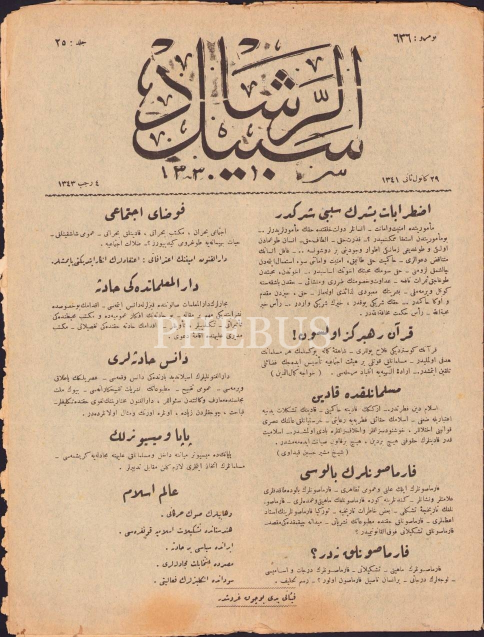 Osmanlıca Sebîlü'r-Reşâd dergisi , No:636, 1341, 20 syf., 24x31 cm, kenarları haliyle