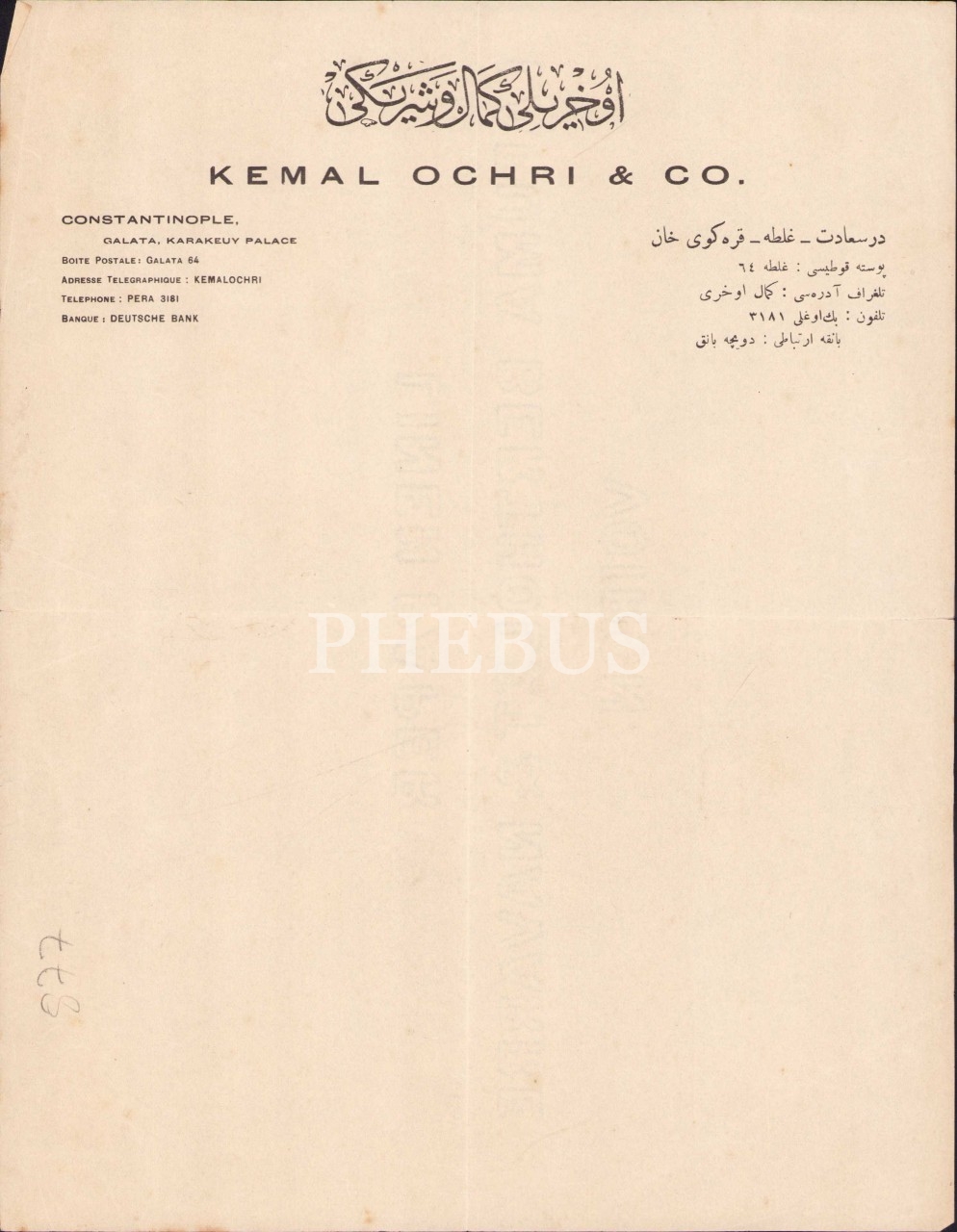 Osmanlıca-Fransızca Ohrili Kemal ve Şeriki antetli boş evrak, Constantinople, 22x28 cm
