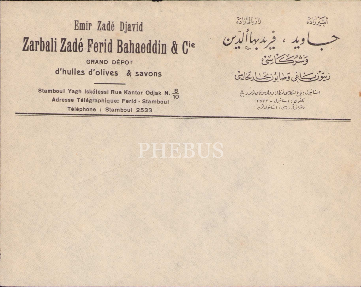 Osmanlıca ve Fransızca çift dilde zarf: Emir Zade Djavid Zarbali Zade Ferid Bahaeddin & Cie - Stamboul