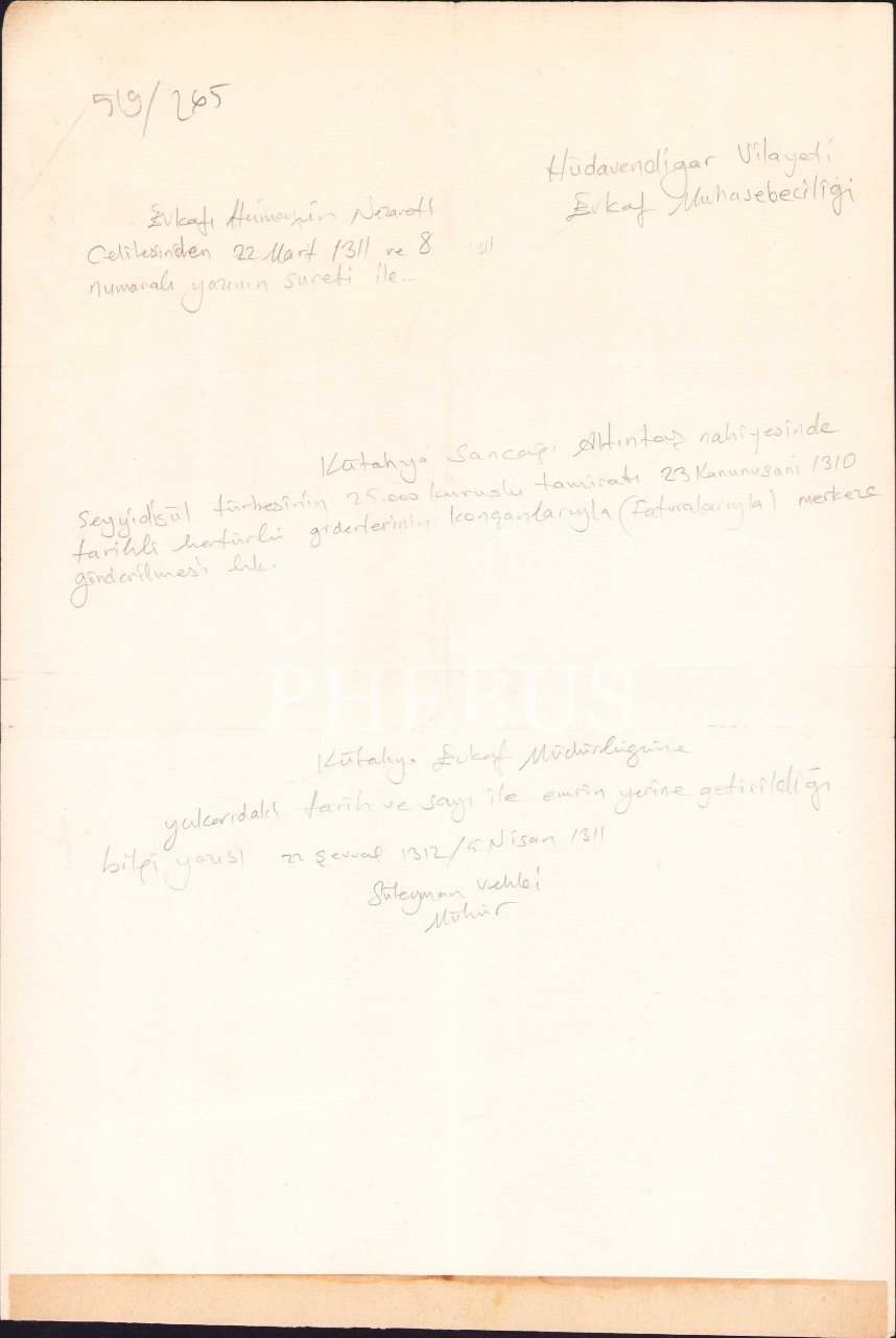 Kütahya'da bir türbe tamiratının giderleri hakkında