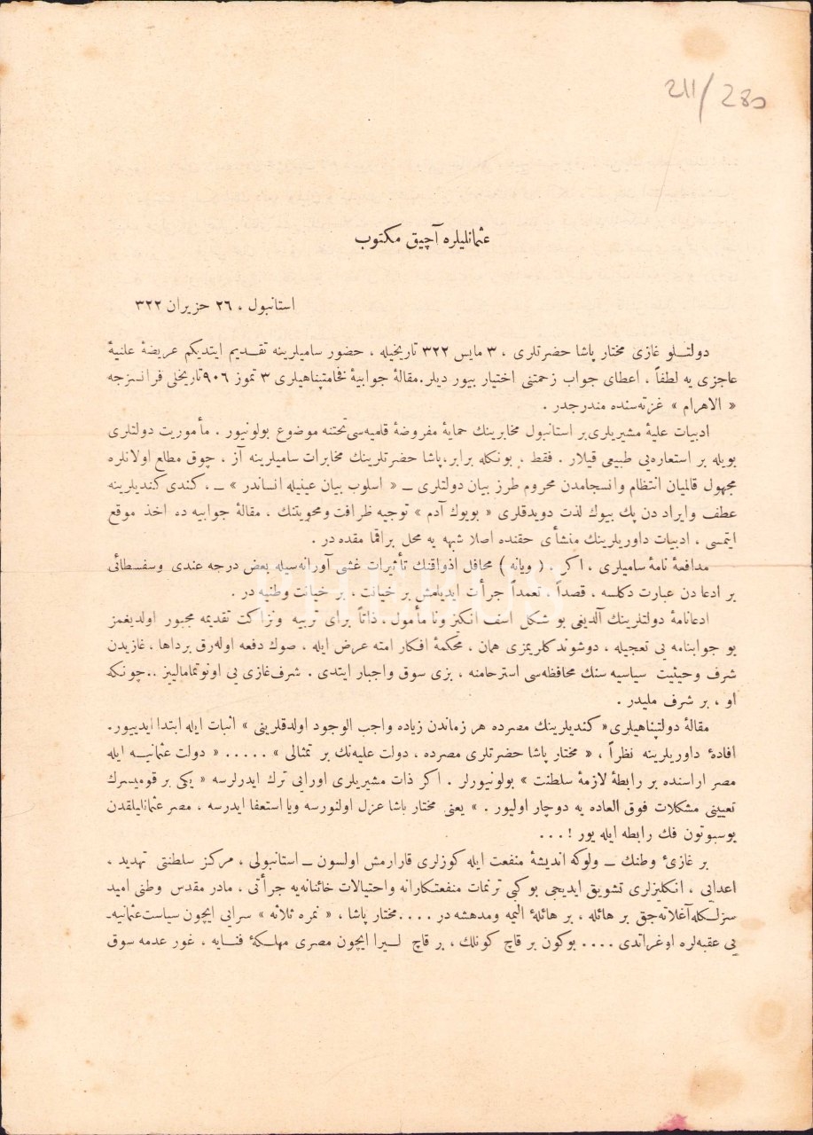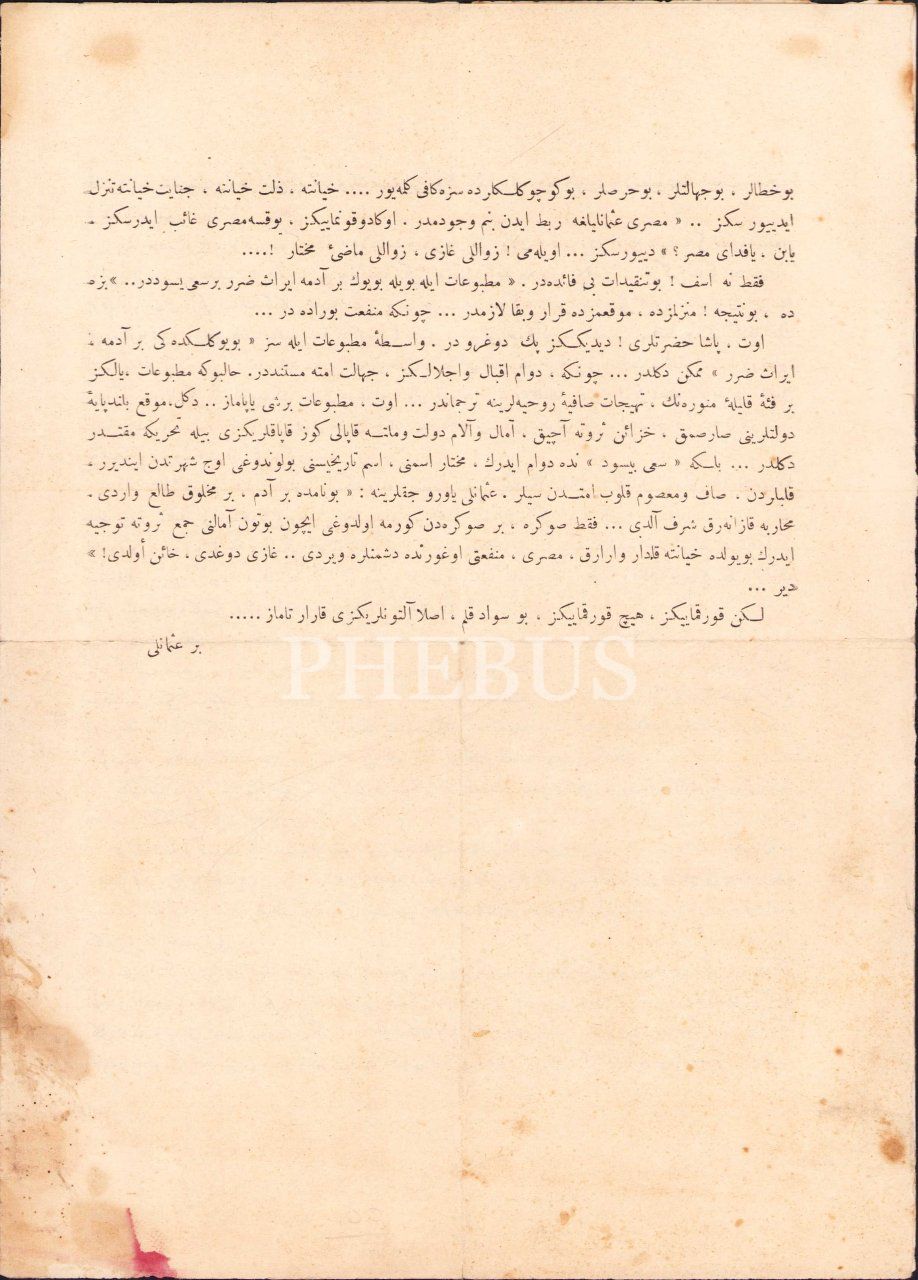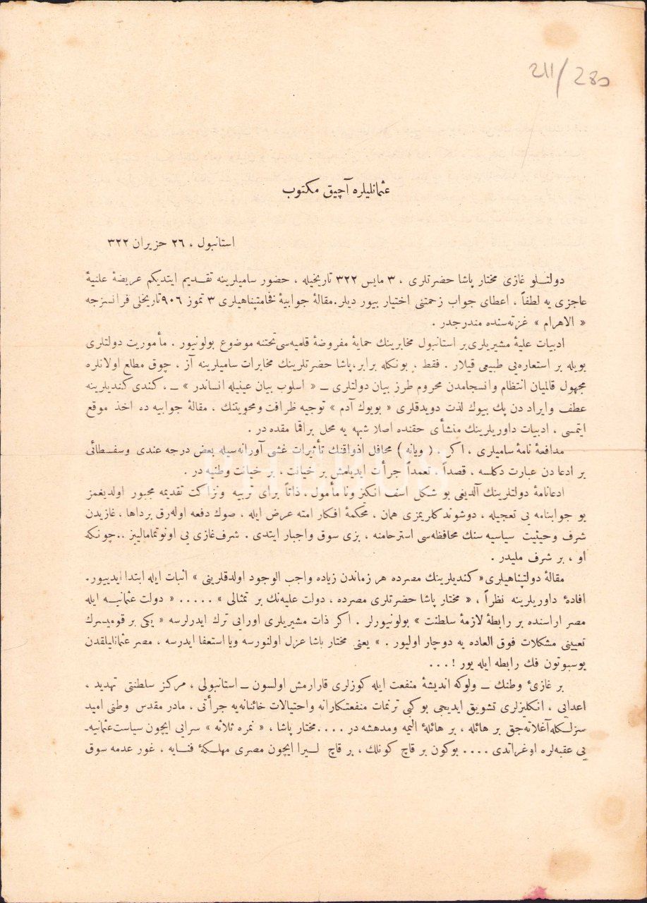 Osmanlıca "Osmanlılara Açık Mektup" başlıklı, "Bir Osmanlı" imzalı ve Gazi Muhtar Paşa'yı hedef alan propaganda metni, 1322, 28x40 cm