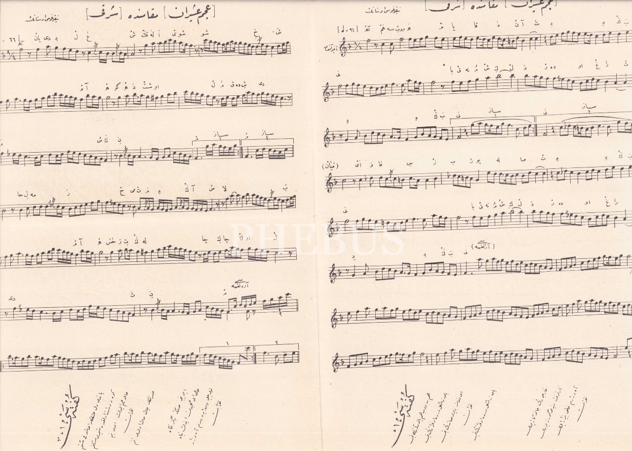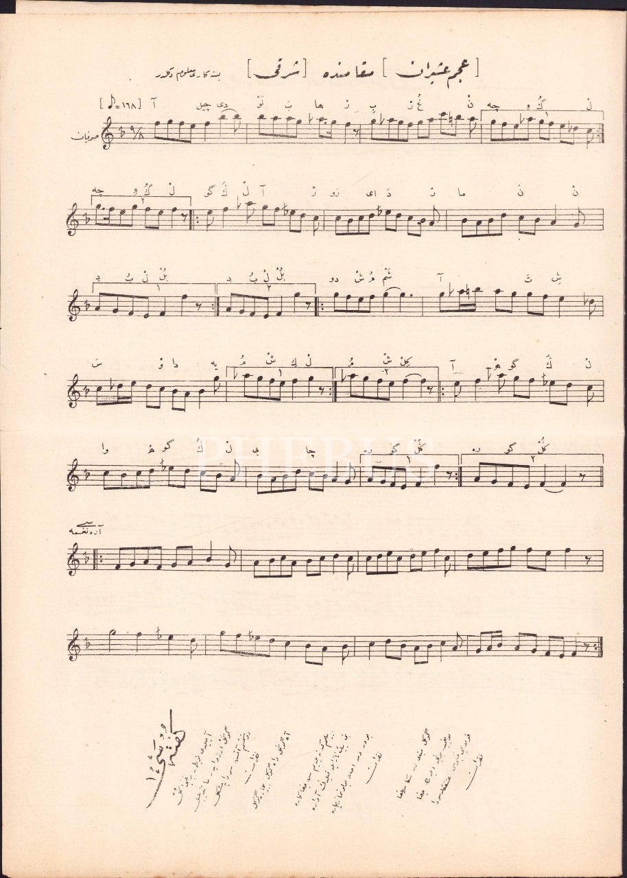 Osmanlıca Dârü'l-Elhân Külliyâtı Acem Aşiran makamında güfteli üç şarkı notası, 34x49 cm