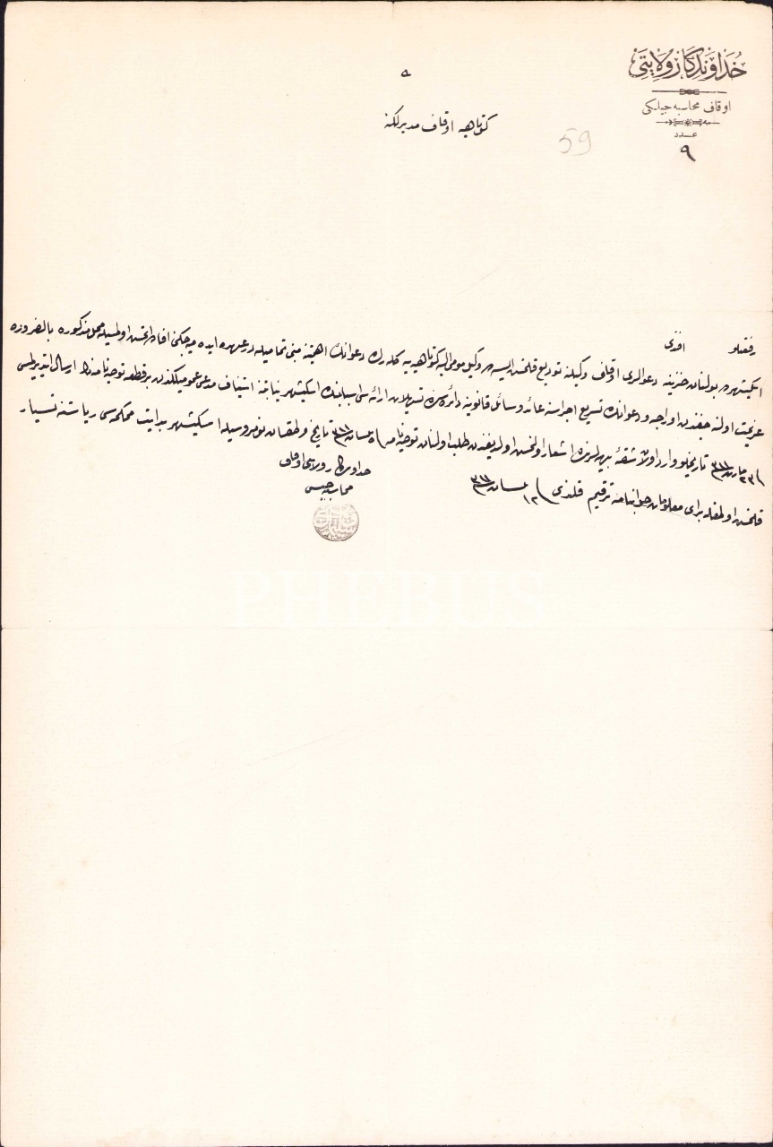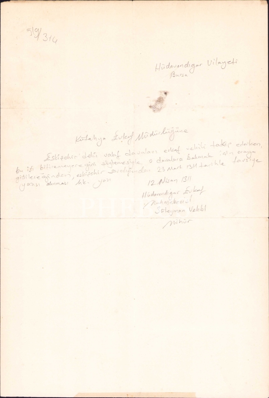 Osmanlıca Hüdâvendigâr Eyâleti [Bursa] Evkâf Muhasebeciliği antetli evrak, 1311, 23x34 cm