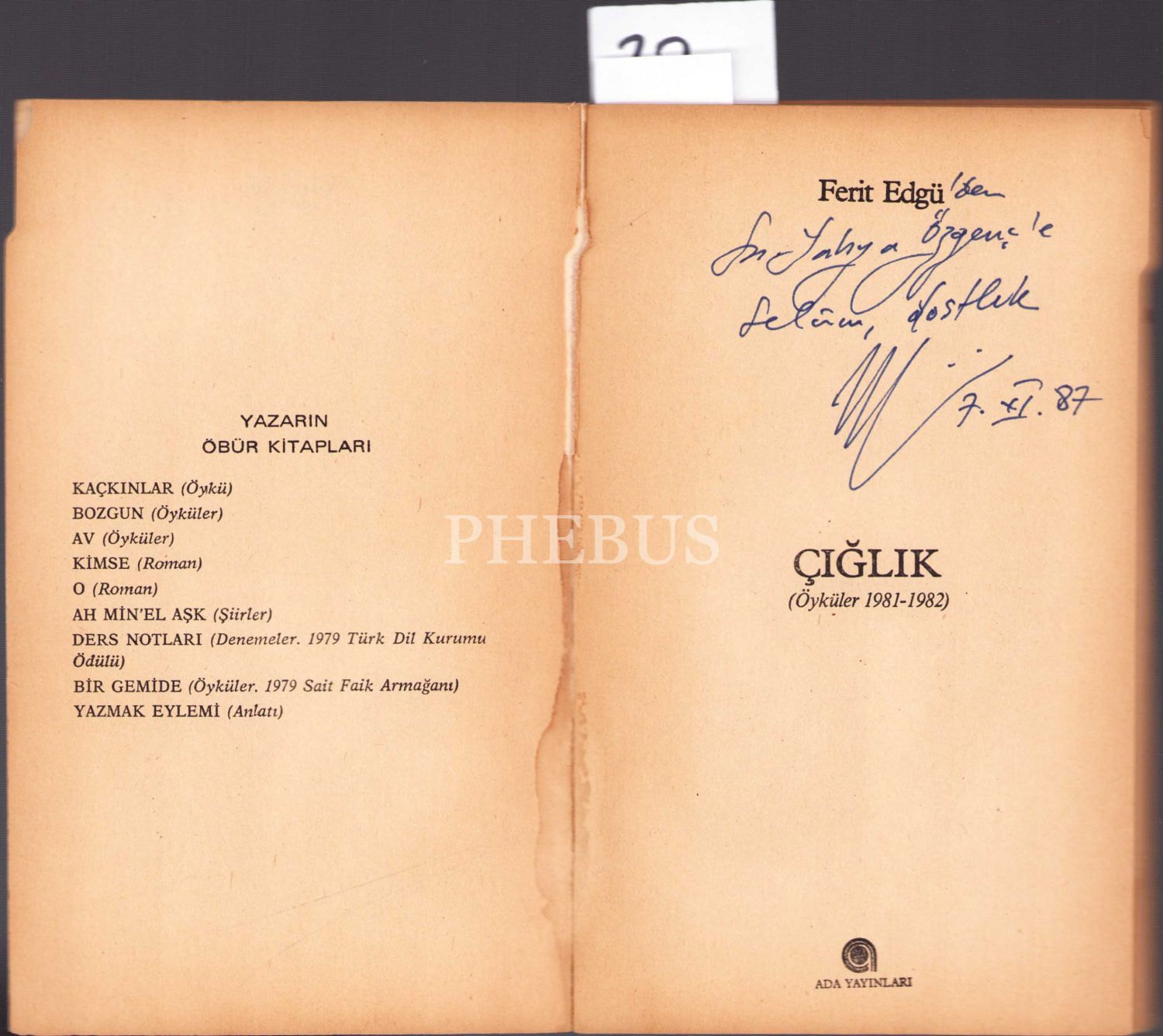 Ferüt Edgü'den İmzalı ve İthaflı Öyküleri: Çığlık, Ada Yayınları, 1982, 99 sayfa