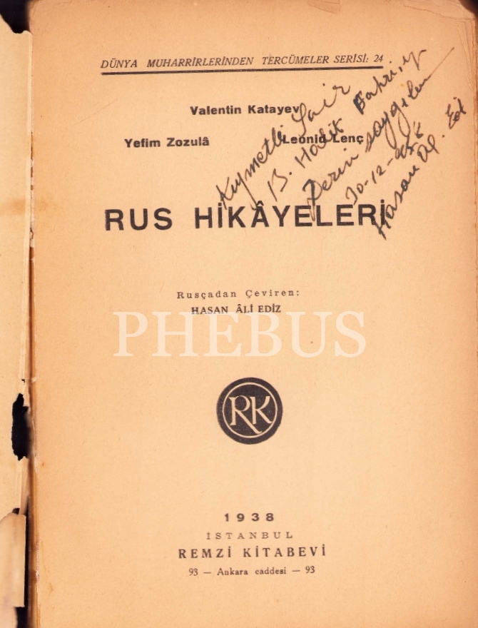 Valentin Katayev- Y. Zozula- L. Lenç "Rus Hikayeleri", Çeviren Hasan Ali Ediz'den Şair Halit Fahri Ozansoy'a ithaflı ve imzalı, Remzi Kitabevi, 1938, 189 sayfa