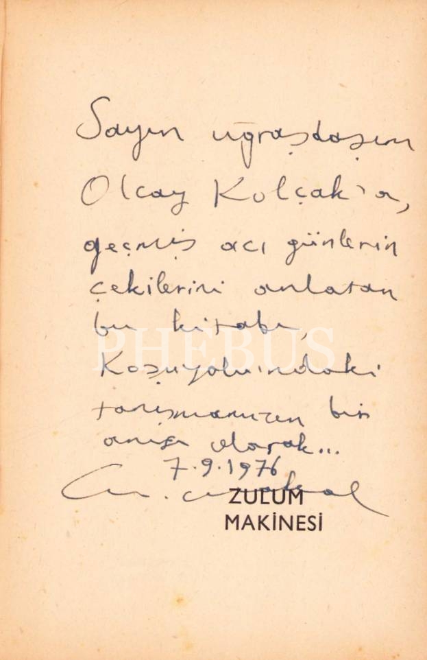 İthaf "Sayın uğraşdaşım Olçay Kolçak'a geçmiş acı günlerin çekilerini anlatan bu kitabı Koşuyolu'ndaki tanışmamızın bir anısı olarak... 7.9.1976 M. Makal" şeklindedir. Yazar, şair ve öğretmen Mahmut Makal 1930'da Aksaray'da doğdu. 1950'de yayınladığı Bizim Köy romanıyla "Köy Edebiyatı" akımını başlatmıştır. Mahmut Makal 2018 senesinde Ankara'da vefat etti.