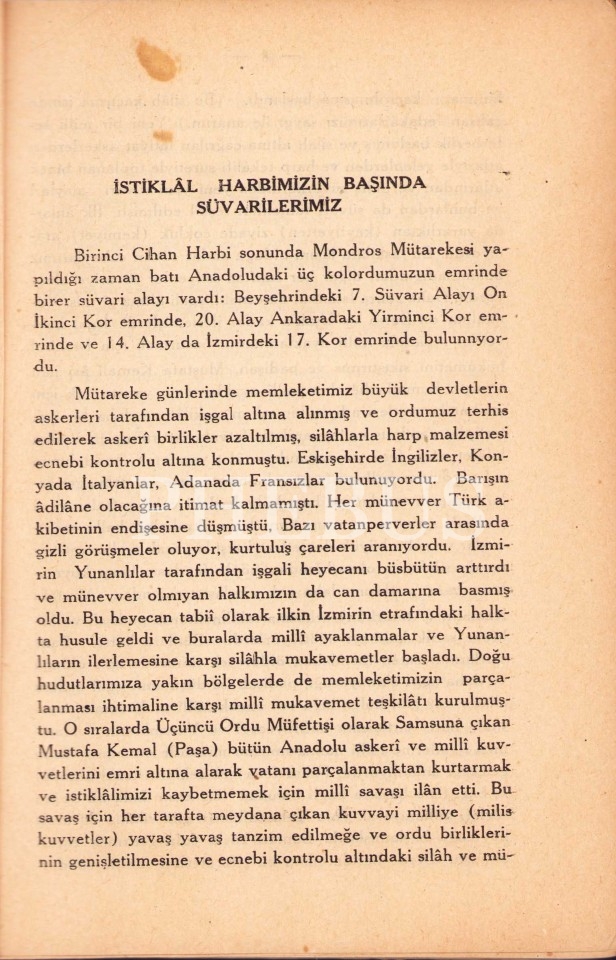 İthaf "Kemal Organ Bey'e bir hatıra F.Altay" şeklindedir. Fahrettin Altay, 1880 yılında Anavutluk- İşkodra'da doğdu. Harp Okulu'nu 1900, Harp Akademisi'ni de 1902 yılında bitirdi. Kurmay yüzbaşılığı sırasında, ilk görev yeri olan VI. Ordu'da Dersim ve çevresindeki aşiret süvari alaylarının sayıca azaltılmasıyla görevlendirildi. Bu bölgede sekiz yıl kalan Fahrettin Altay, 1910'da Erkanı Harbiye I. Şube müdürlüğüne atandığı zaman binbaşıydı. Büyükçekmece'deki Donanma Komutanlığı'nda bir süre refakat subaylığı yaptı (1912). 1913'te Çatalca'da kendisini önemli bir görev bekliyordu. Balkan Savaşı'nı kazanan Bulgar ordusu Edirne'ye kadar gelmiş, bölgeyi egemenliği altına almıştı. Çatalca Aşiret Süvari Tugayı'nın başında Bulgar birliklerini geri püskürttü. 1914 yılı da Fahrettin Altay için oldukça hareketli geçti. O yıl yarbaylığa yükselmişti. Önce IV. Kolordu kurmayı oldu. Arkasından ikinci defa Erkanı Harbiye Şube Müdürlüğü yaptı. Birinci Dünya Savaşı'nın yaklaşması yüzünden asker taşıma işleri arttığı için Anadolu demiryollarını düzenlemekle görevlendirildi. Yıl sona ermeden Harbiye Nezareti emrinde çalışmak üzere İstanbul'a döndü. 1915'te Albay oldu ve Harbiye Nezareti Müsteşar yardımcılığından başka askeri protokol memurluğu yaptı. V.Ordu'nun emrinde çalıştı. 1917'de Vehip Paşa ile birlikte Almanya'ya giden heyette yer aldı. 1917'de 26. Tümen komutanlığı, 1918'de 15. Kolordu Komutan vekilliğine ve gene aynı yıl 12. Ordu komutanlığına atandı. Birinci Dünya Savaşı'nın bittiği sıralarda Altay, 3. Kolordu kumandanıydı (Nisan 1919). Kurtuluş Savaşı'nın başlarında 12. Kolordu Kumandanlığına atandı. Bu görevi 1921, ortalarına kadar sürdü. Birliğinin başında, Konya'da patlak veren Delibaş Ayaklanmasının bastırılmasından (1920), Birinci ve ikinci İnönü ve Sakarya savaşlarına kadar hep ateş hattında bulundu. Kurtuluş Savaşı'nın belirli bir aşamaya ulaştığı 1921'de Altay, tümgeneralliğe yükseltildi. Sorumluluğu da genişletilerek kolordu komutanı yetkisiyle Süvari grup komutanlığına getirildi.