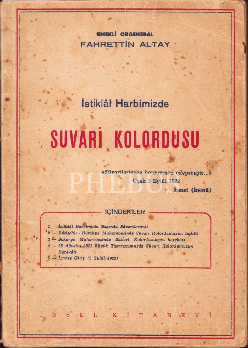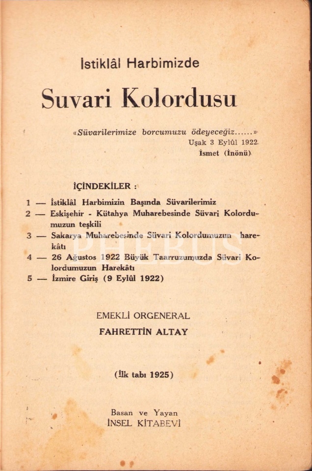 İstiklal Harbi Kumandanlarından Orgeneral Fahrettin Altay'dan imzalı ve ithaflı "İstiklal Harbimizde Suvari Kolordusu", İlk Baskı, İnsel Kitabevi, 1925, 77 sayfa