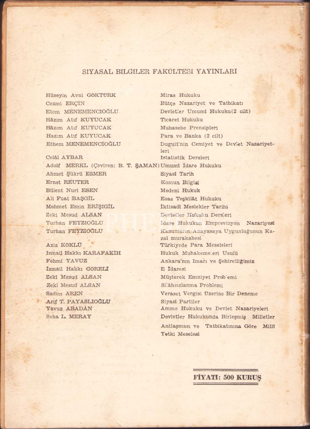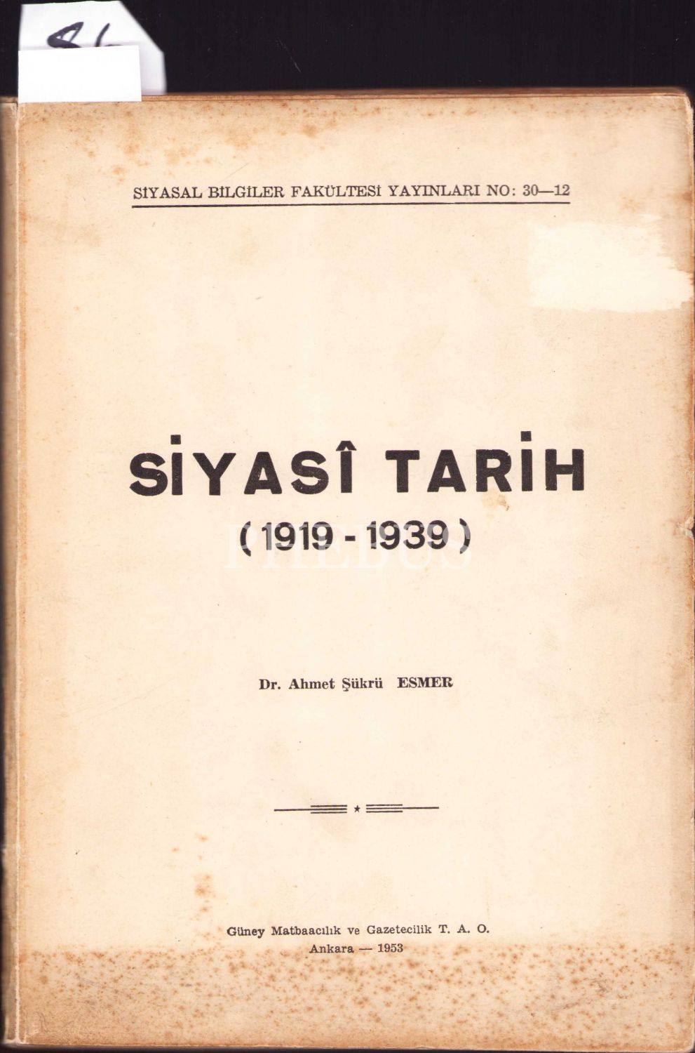 Dr. Ahmet Şükrü Esmer'den Yazar Ethem İzzet Benice'ye ithaflı ve imzalı "Siyasi Tarih (1919-1939)", 1953, Ankara Siyasal Bilgiler Fakültesi Yayınları, 296 sayfa, 17x23 cm