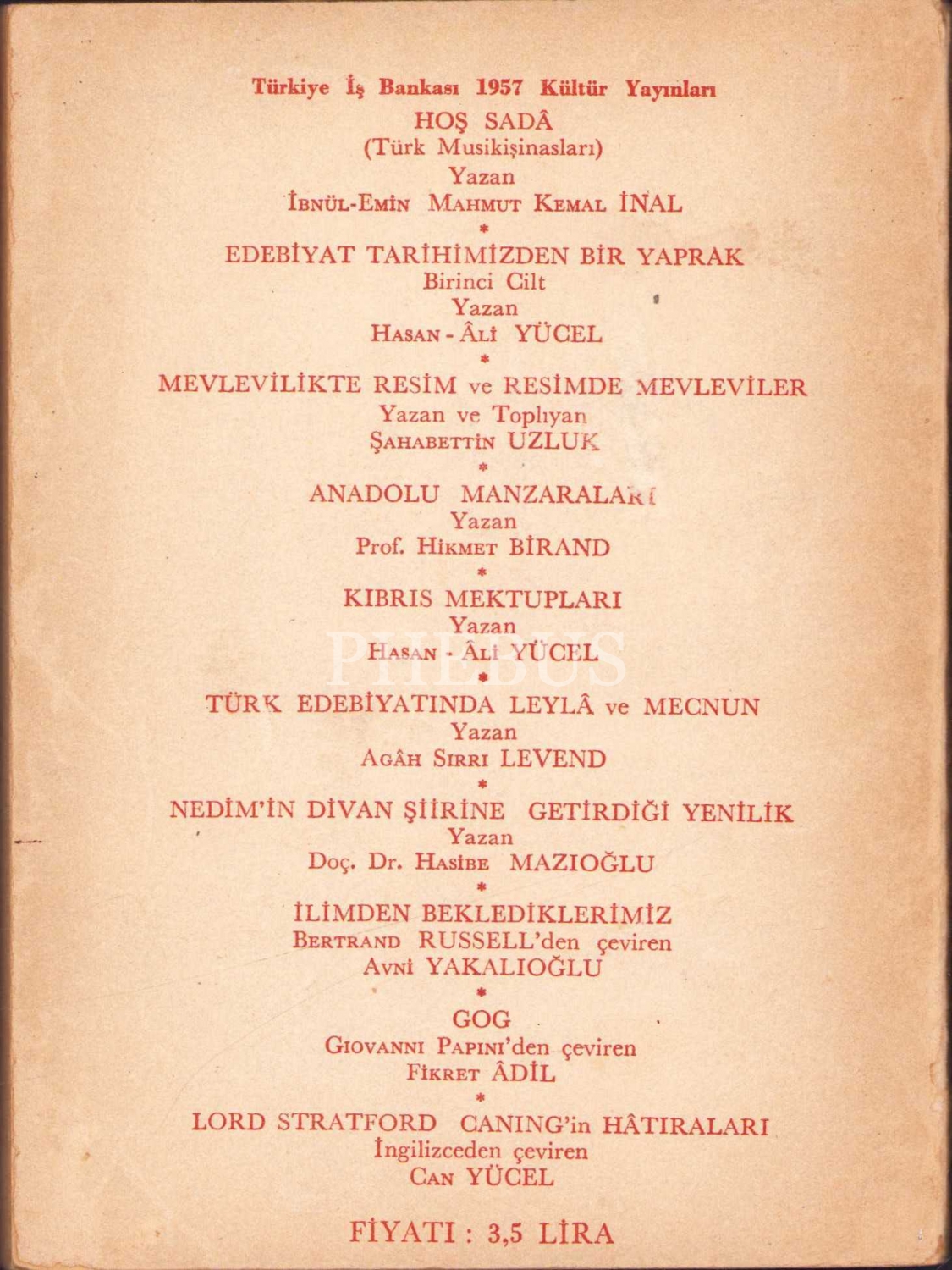 İthaf "Bildim bileli dostluğunu değiştirmeyen asil ruhlu Nail Tur'a. 1 Temmuz 1958" şeklindedir. 1897 senesinde İstanbul'da doğan Hasan Âli Yücel, Mekteb-i Osmani, Vefa İdadisi, Darülmuallimin-i Âliye’de tahsi görmüştür. 1922’de öğretmenlik hayatına başladı. Daha sonra Türk Dili Tetkik Cemiyeti’nin etimoloji kolu başkanlığına getirildi. Köy Enstitüleri ve Tercüme Bürosu'nu kurucusudur. Atatürk'ün vefatından sonra 2. Celal Bayar hükümetinde Milli Eğitim Bakanı oldu. Köy Enstitüleri ve Tercüme Bürosu'nun kurucusudur. 26 Şubat 1961’de vefat etti.