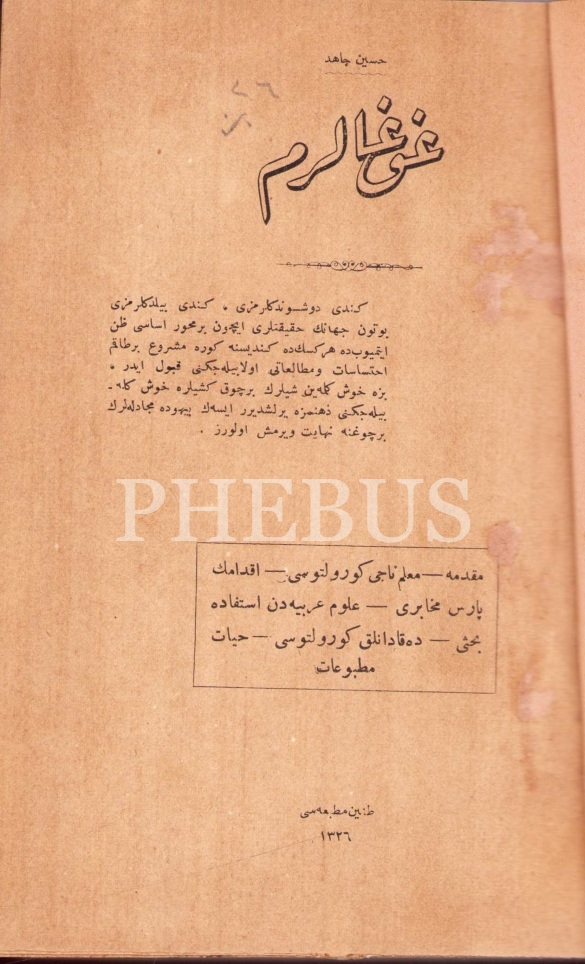 Osmanlıca 7 kitap tek ciltte: Gavgalarım, Hüseyin Câhid, Tanîn Matbaası, 1326, 333 syf.; Efsâneler, Hâlid Fahri, Mahmud Bey Matbaası, İstanbul 1919, 40 syf.; Fırtına ve Kar, Orhan Seyfi, Ahmediye Matbaacılık Şirketi, 1919, 40 syf.;