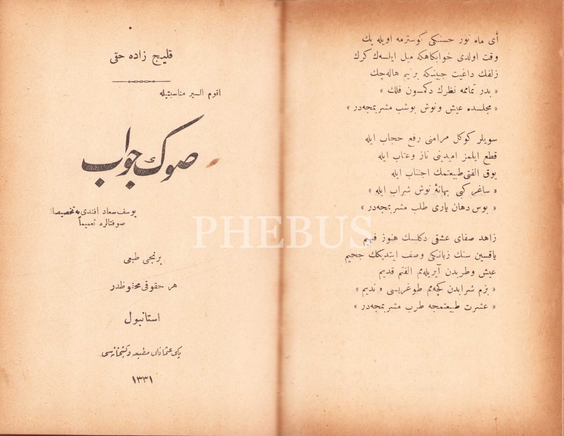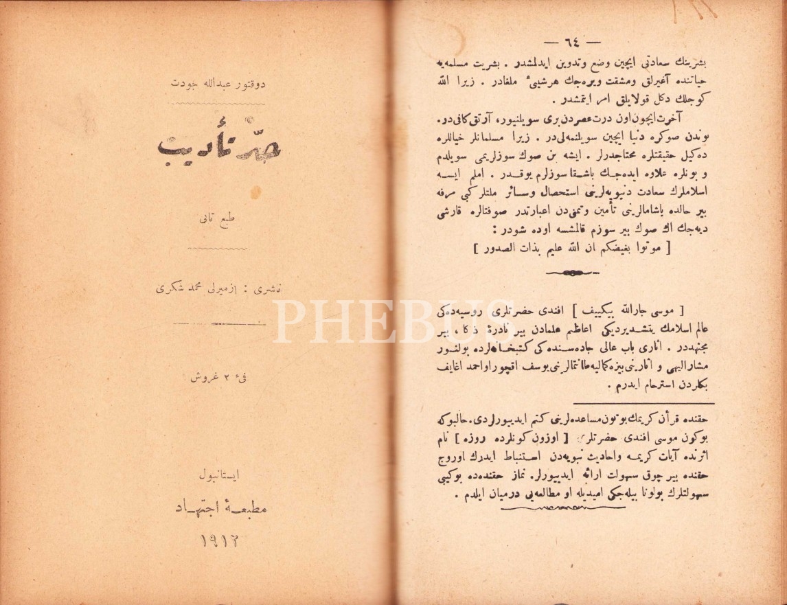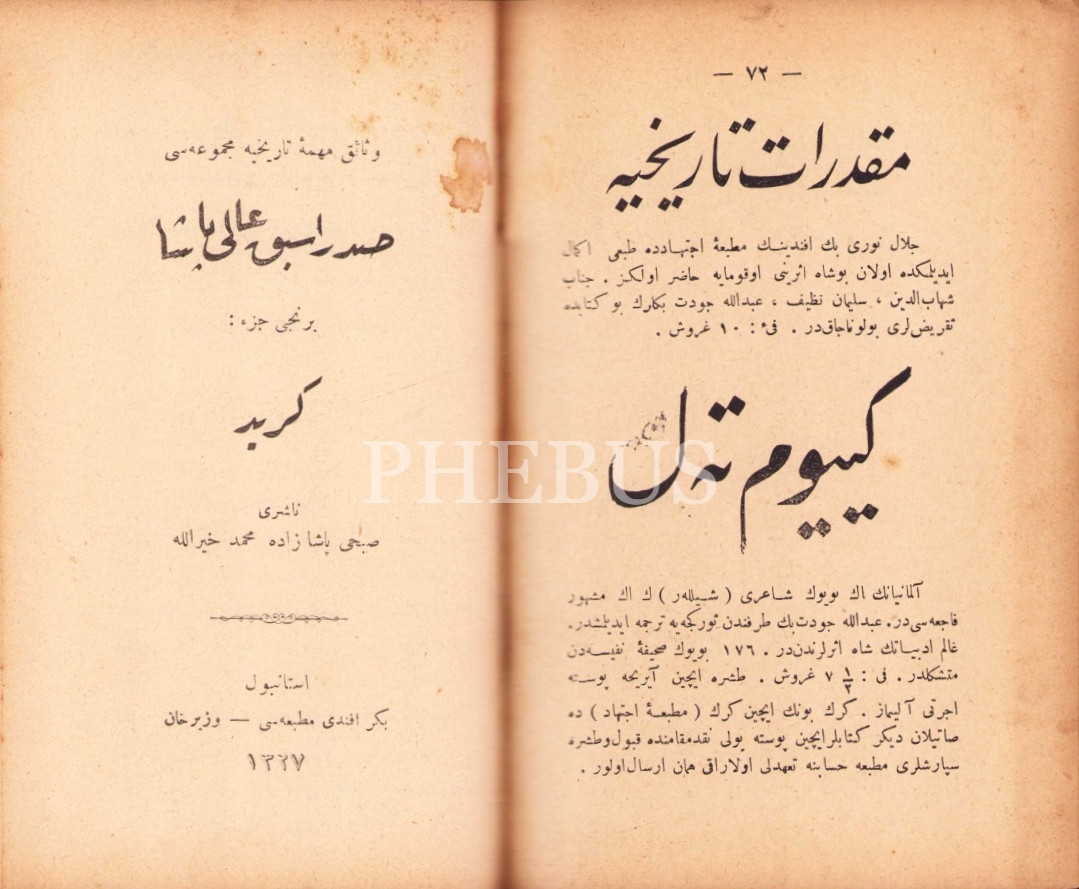 Son Cevâb, Kılıçzâde Hakkı, Yeni Osmanlı Matbaa ve Kütüphanesi, İstanbul 1331, 64 syf.; Hadd-i Te'dîb, Abdullah Cevdet, İctihad Matbaası, İstanbul 1912, 68 syf.; Sadr-ı Esbak Ali Paşa 1. Cild: Girid, Bekir Efendi Matbaası, İstanbul 1327, 20 syf.; Barbaros'un Hafîdi Metin Hamidiyye'nin Kahraman Kumandan Rauf Bey, Nazîmâ, 1328, 31 syf., 13x18 cm