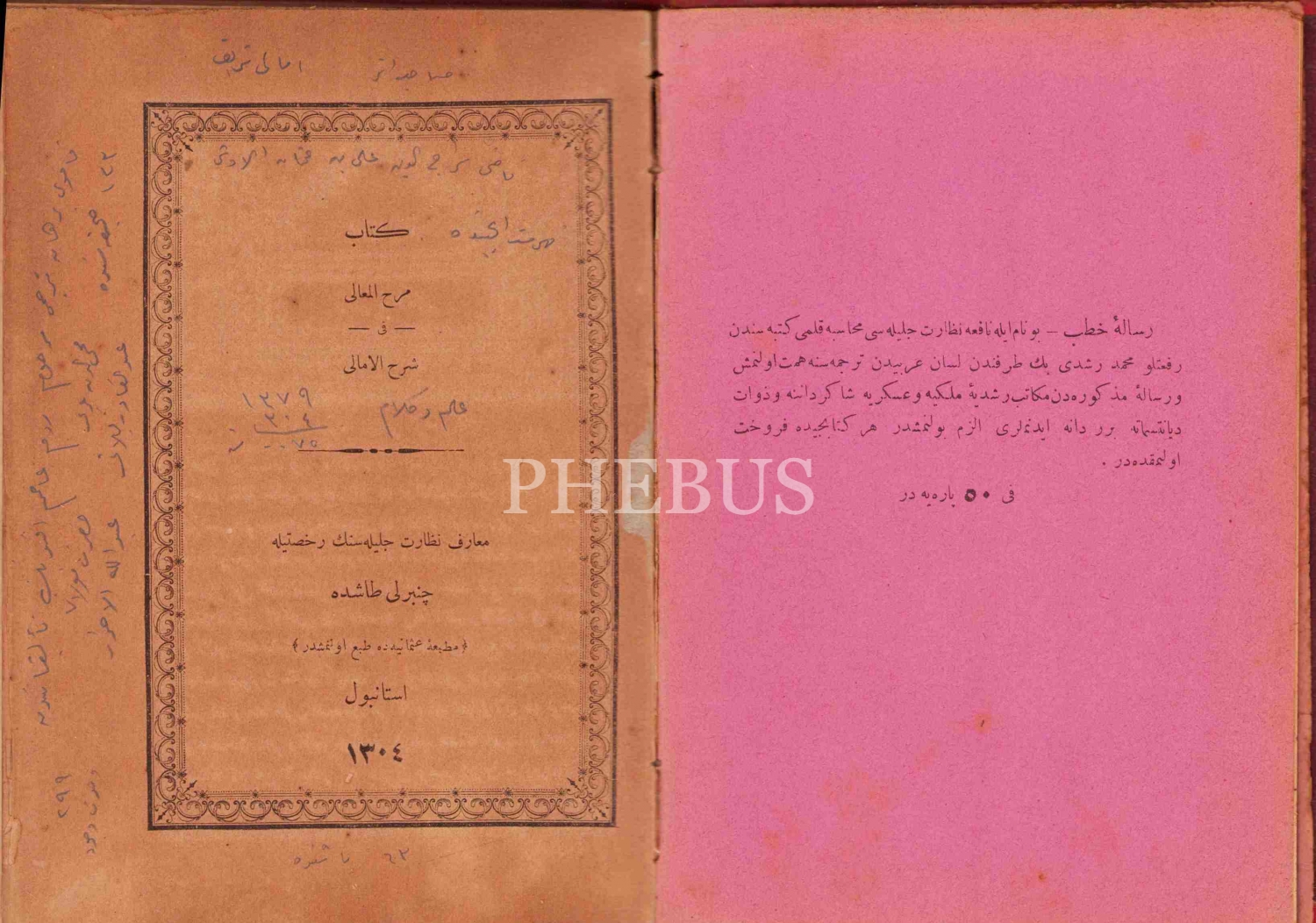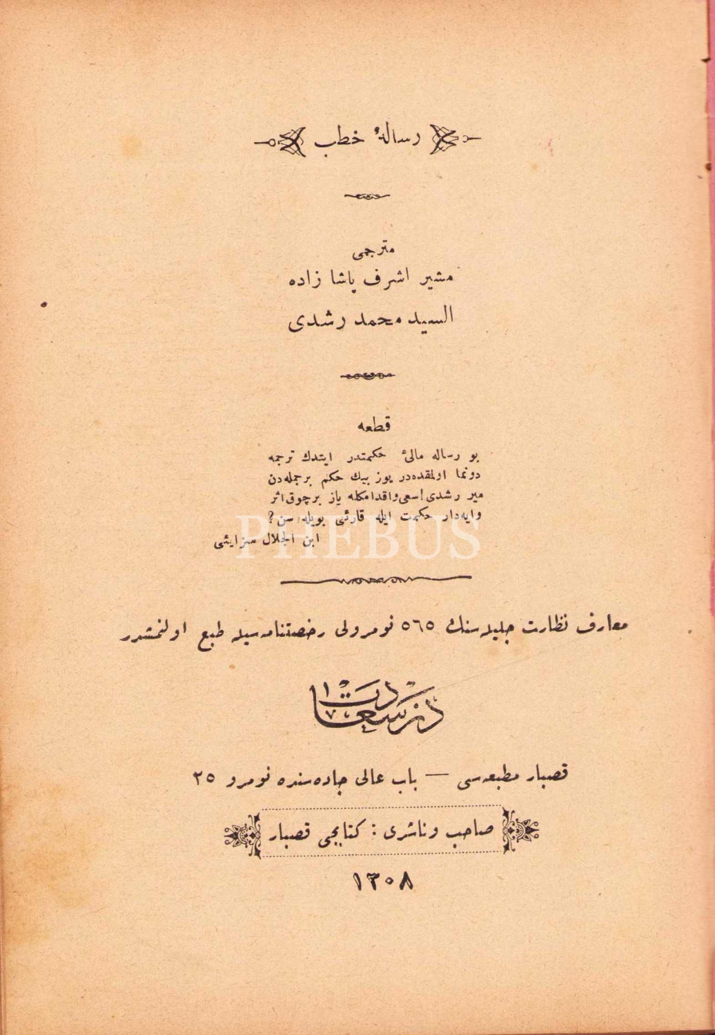Osmanlıca 2 kitap tek ciltte: Risâle-i Hutab, Çev.: Mehmed Rüşdi, Kasbar Matbaası, Dersaadet [İstanbul] 1308, 16 syf.; Merahu'l-Meâlî fî Şerhi'l-Emâlî, Osmaniye Matbaası, İstanbul 1304, 246 syf., 14x20 cm