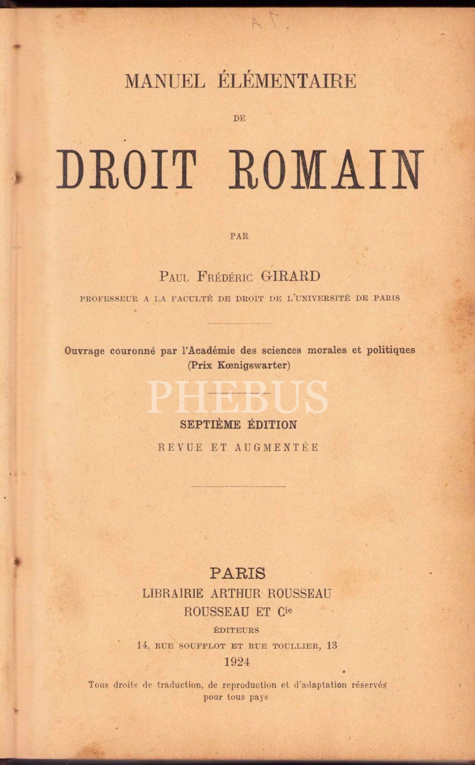 Fransızca Manuel Elementaire de Droit Romain, Paul Frederic Girard, Paris/Fransa 1924, 1158, 14x22 cm
