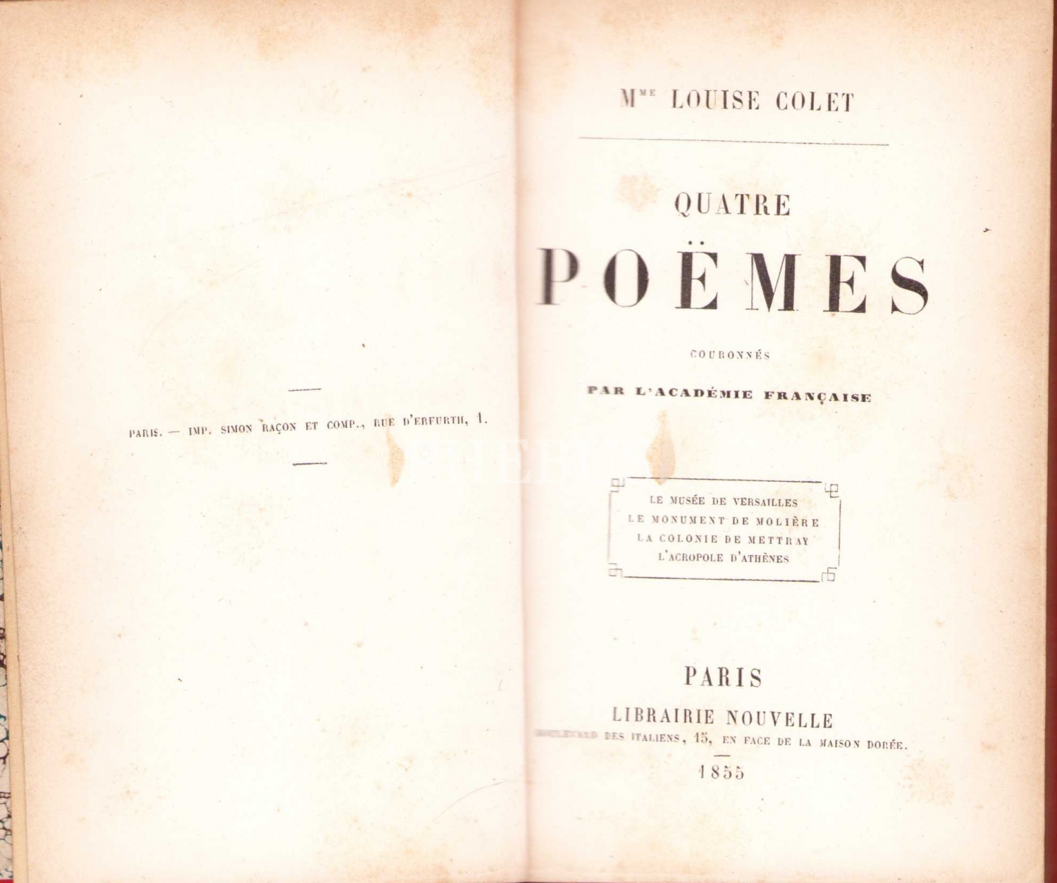 Fransızca Quatre Poemes, Louise Colet, Paris/Fransa 1855, 121 syf., 9x15 cm