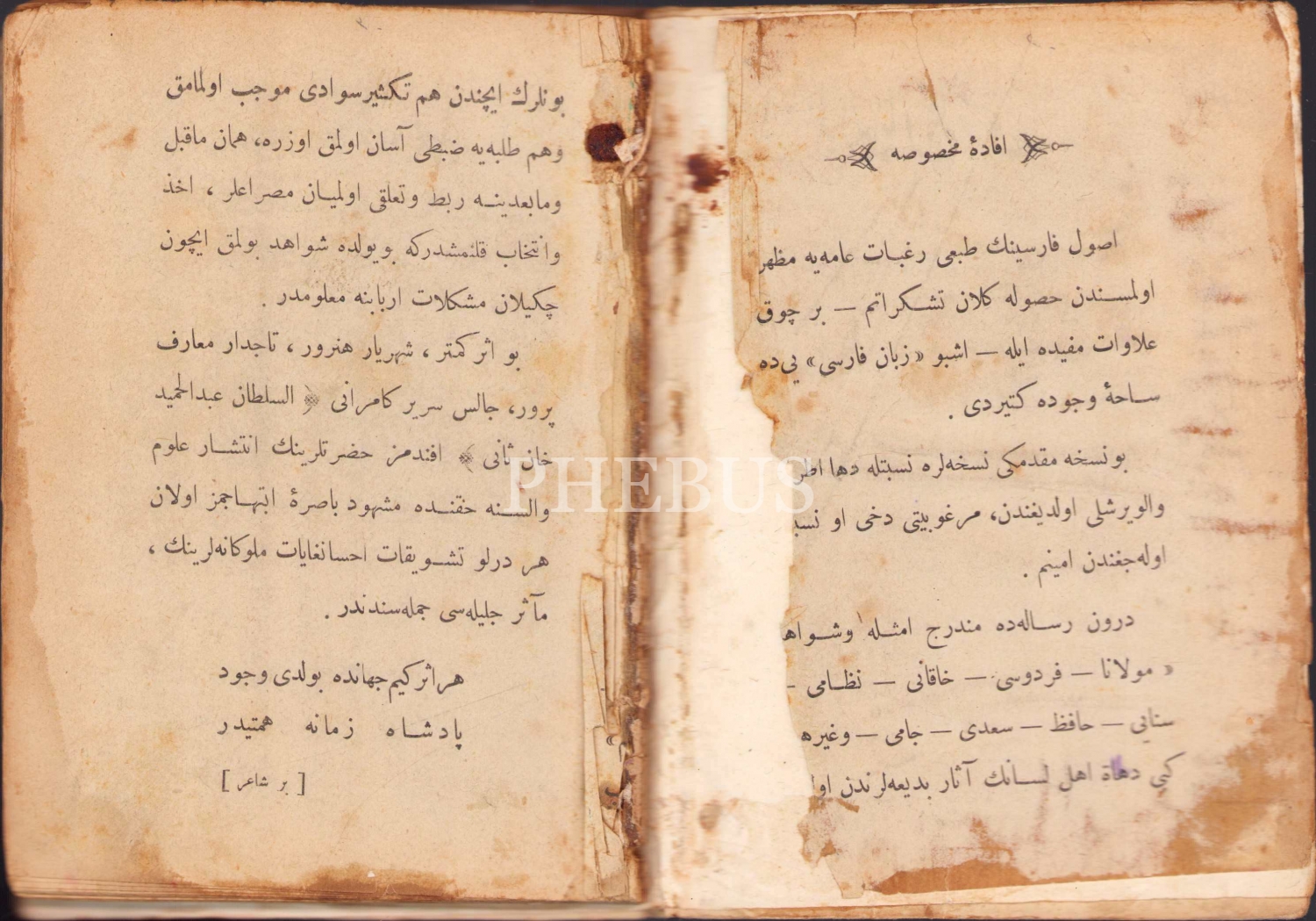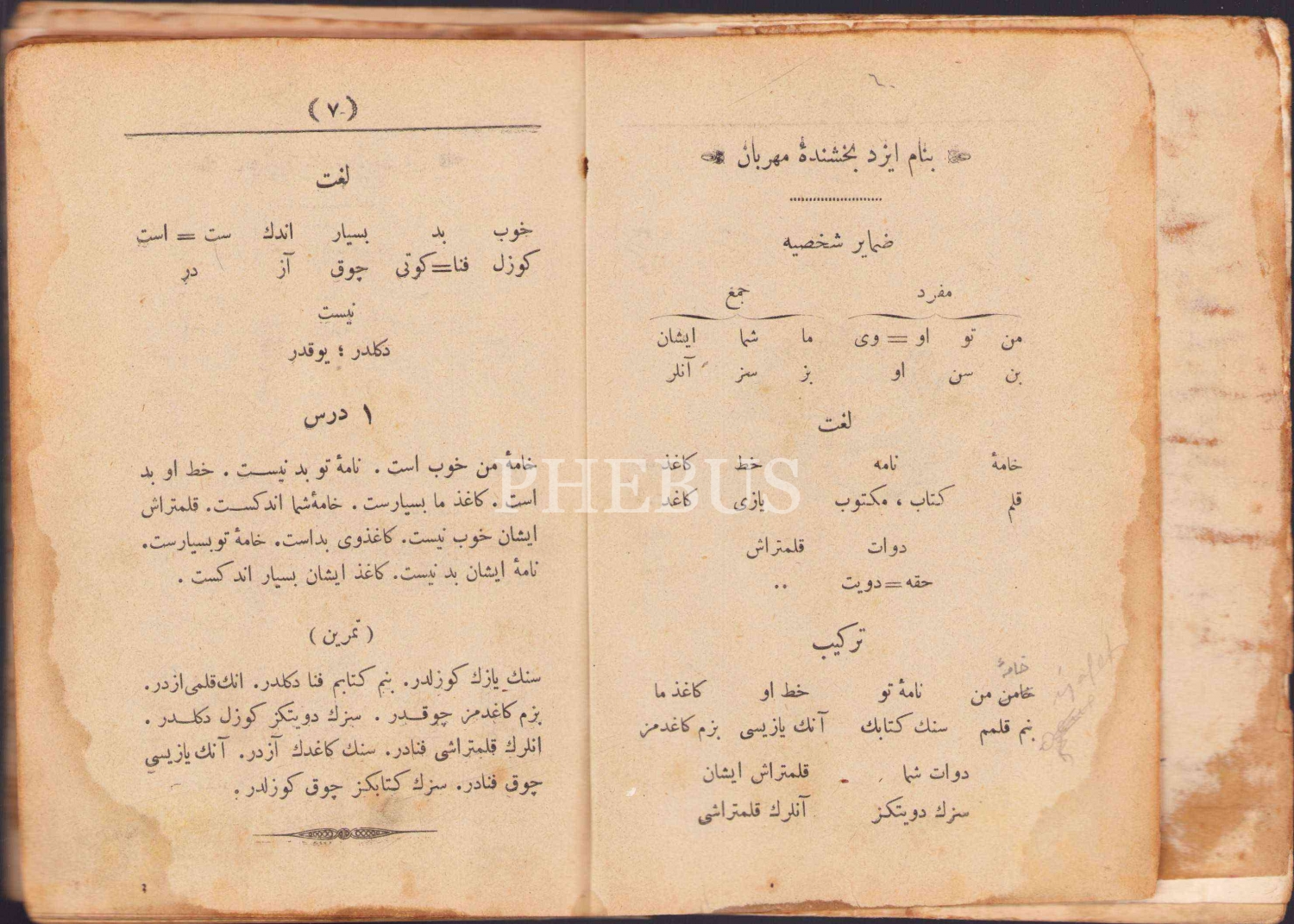 Osmanlıca-Farsça Zebân-ı Fârsî, 1325, 156 syf., 13x17 cm, sırtı haliyle, künye sayfası eksik