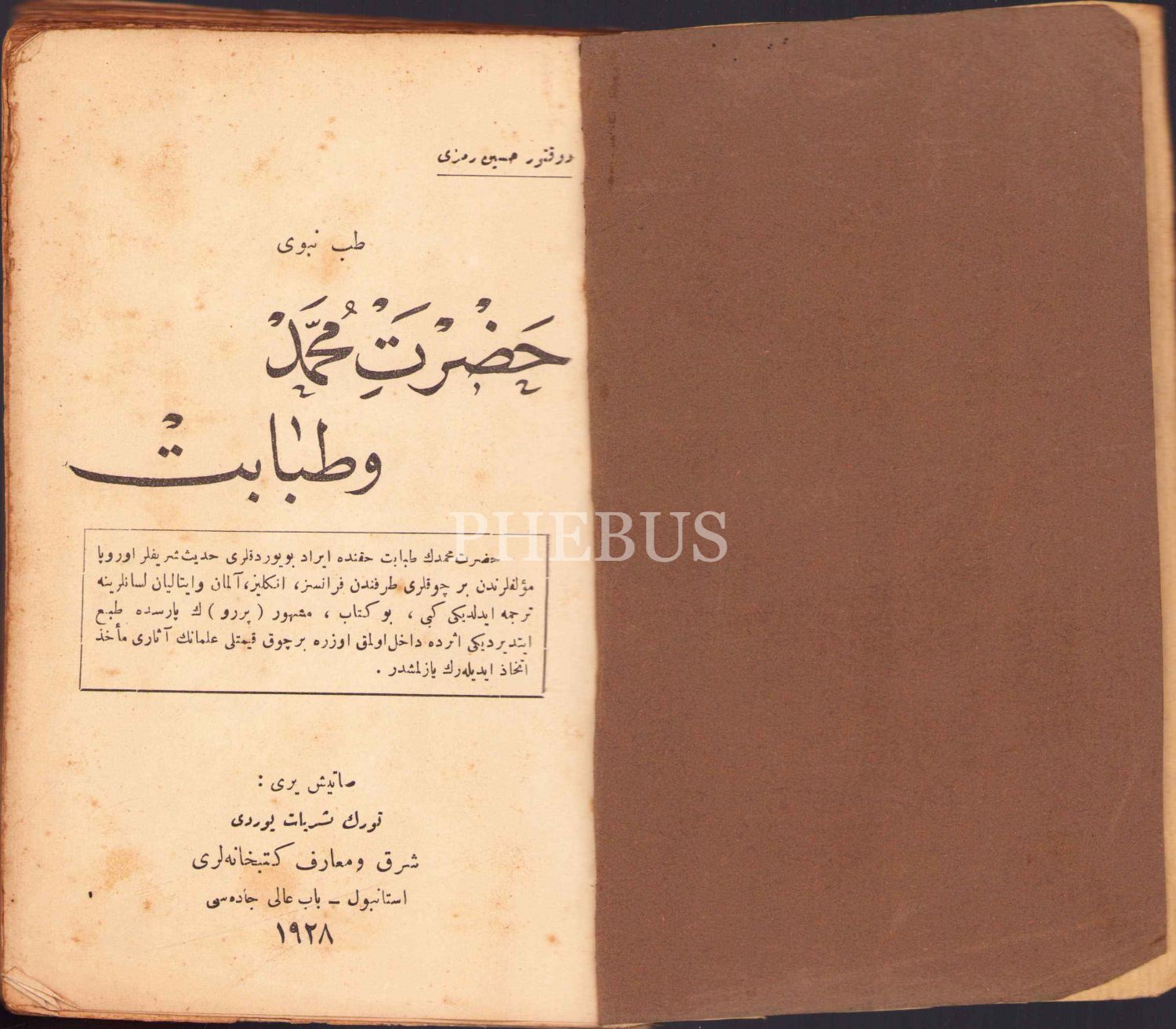 Osmanlıca Tıbb-ı Nebevî - Hz. Muhammed ve Tabâbet, Hüseyin Remzi, Türk Neşriyât Yurdu, İstanbul 1928, 175 syf., 13x20 cm