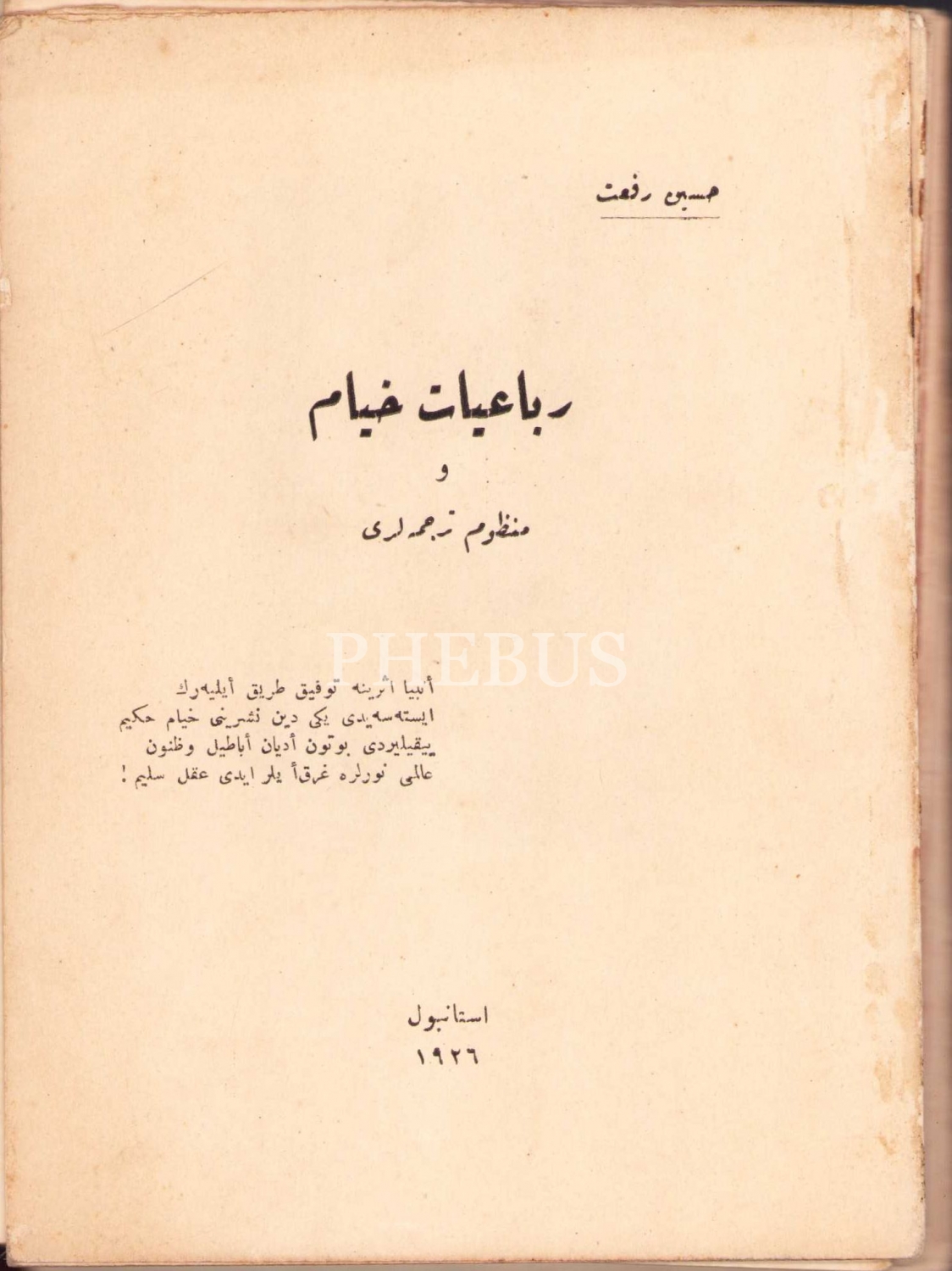 Osmanlıca-Farsça Rubâiyyât-ı Hayyâm ve Manzûm Tercümeleri, Hüseyin Rıfat, İstanbul 1926, 159 syf. (48 ila 65 arası eksik), 12x17 cm, sayfaları açılmamış