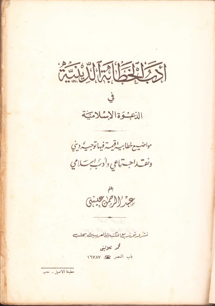 Arapça Edebü'l-Hitâbeti'd-Dîniyye fi'd-Da'veti'l-İslâmiyye (İslami Davette Hutbe Edebiyatı) [İlk Baskı], Abdurrahman İsa, Matbaatu'l-Asîl, Halep, 551 syf., 17x25 cm