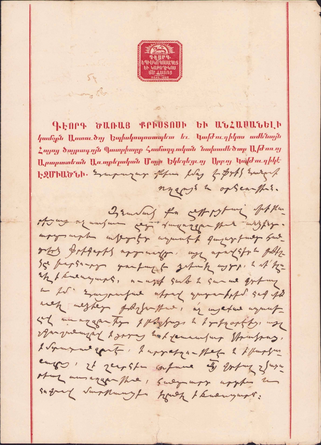 Başrahip Kevork'un 'Eftik Hanıma öğüt veren mektubu, İstanbul doğumlu Baş rahip Kevork İstanbul'dan Ermenistan'a gidip Gatoğigos olur (Ermeni din adamlarının en kutsal ünvanı), 1873 tarihli, 527 numaralı kayıtlı, 2 yaprak, 21x28cm