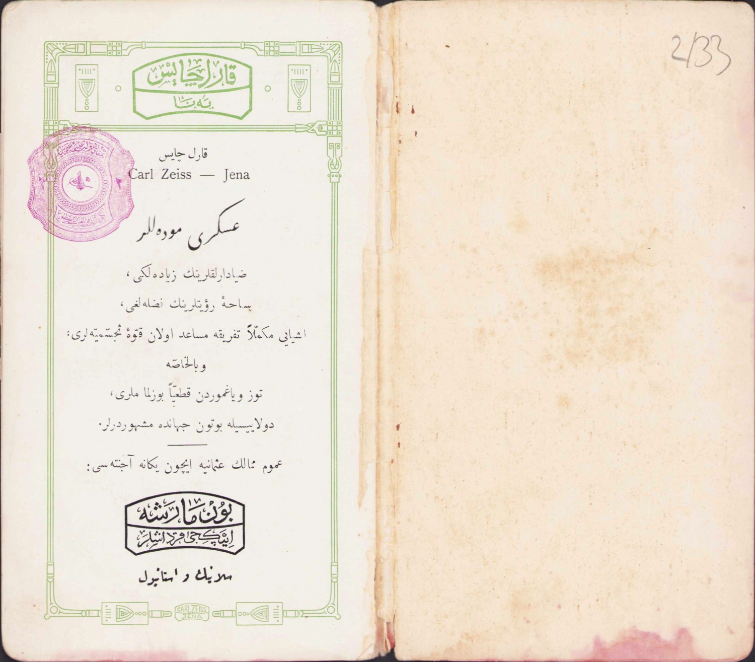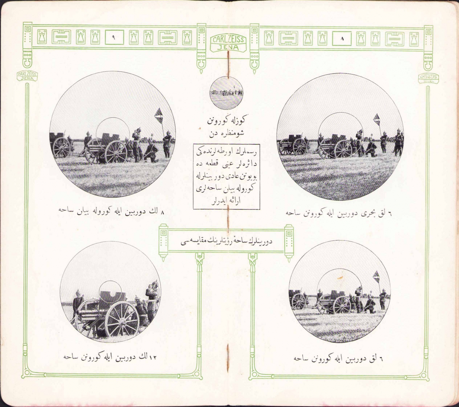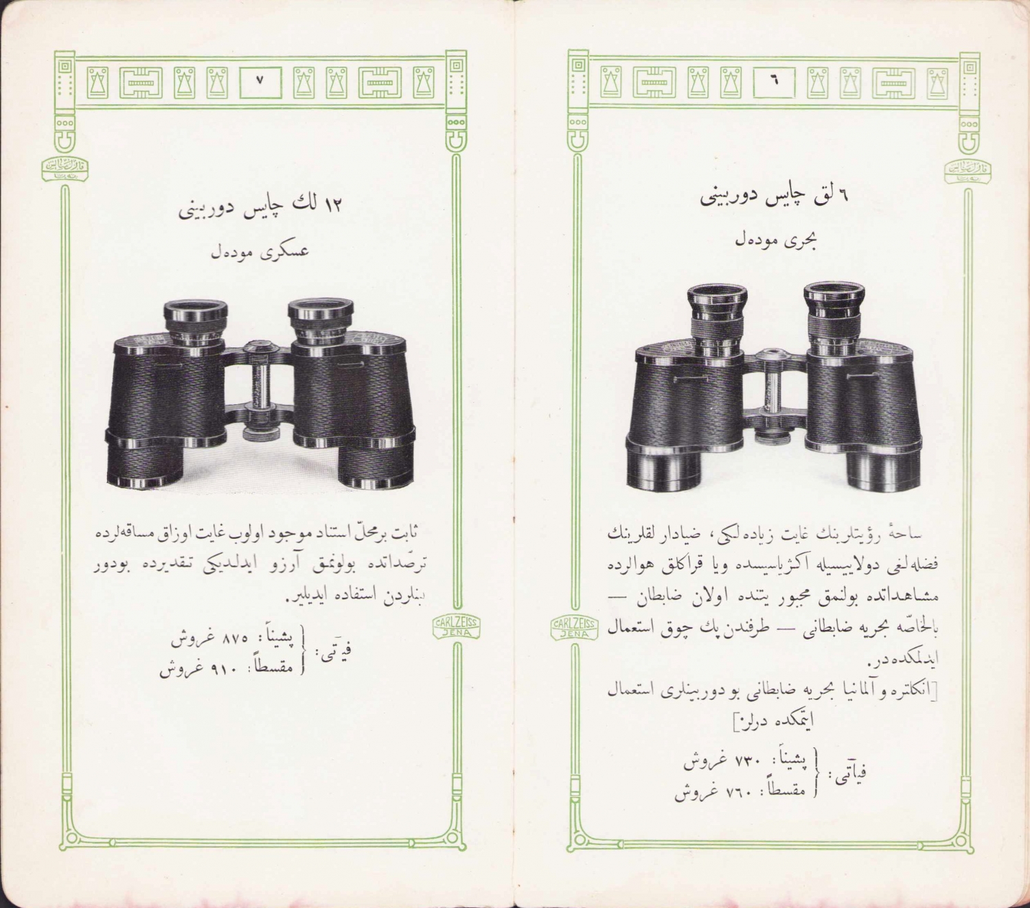 Selanik ve İstanbul'da neşredilmiş, bu kitapçıkta 8'lik, 12'lik ve iki farklı modeli bulunan 6'lık Zeiss dürbünlerinin son derece kaliteli fotoğrafları gerekli bilgileriyle birlikte takdim edilmiş, Osmanlıca, 16 sayfa, 10x18cm