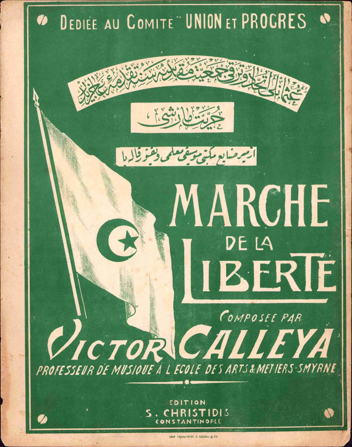 Osmanlı İttihat ve Terakki Cemiyeti Mukaddesesine takdim olunan Hürriyet Marşı, İzmir Sanayi Mektebi Musiki Muallimi Victor Calleya, kapak Türk bayrağı detaylı, 4 sayfa, 26x33xm