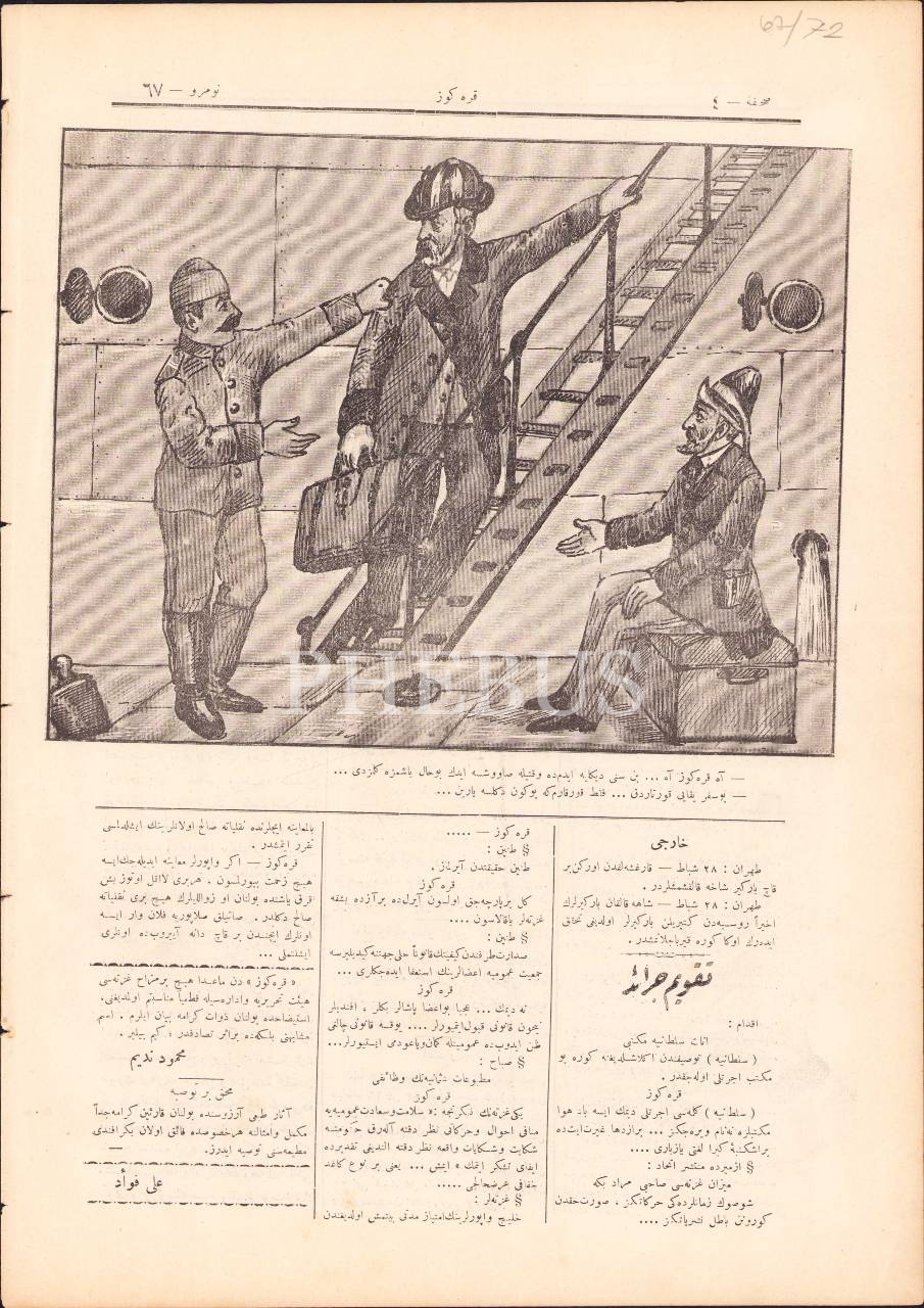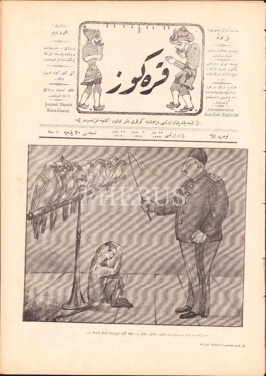 Osmanlıca Karagöz gazetesi, 67. sayı, 15 Mart 1909 tarihli, "Rütbe... Rütbe... Rütbe... Nişan, nişan, nişan... Başka laf söyleyince dayak var ha...", 4 syf., 27x38 cm