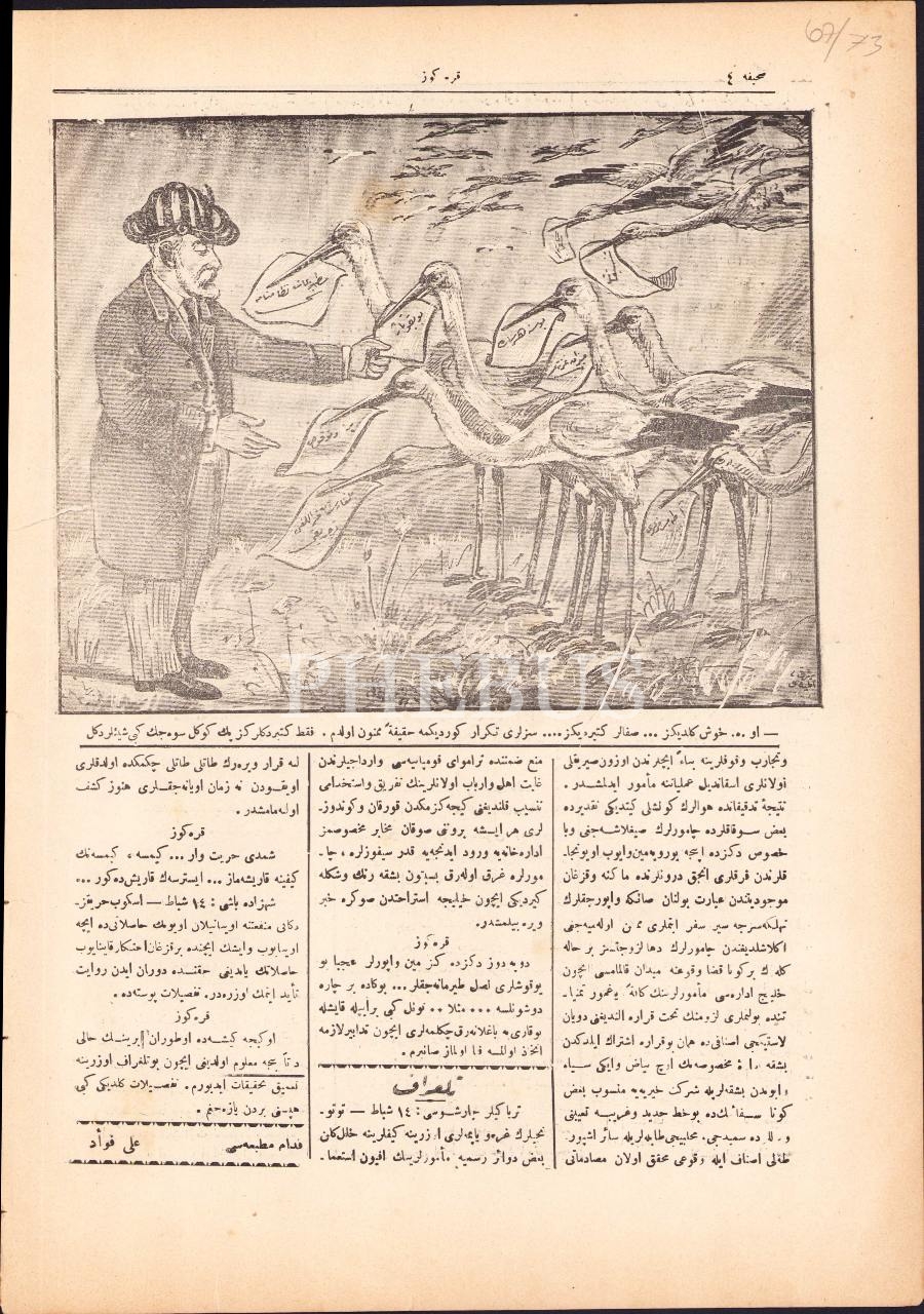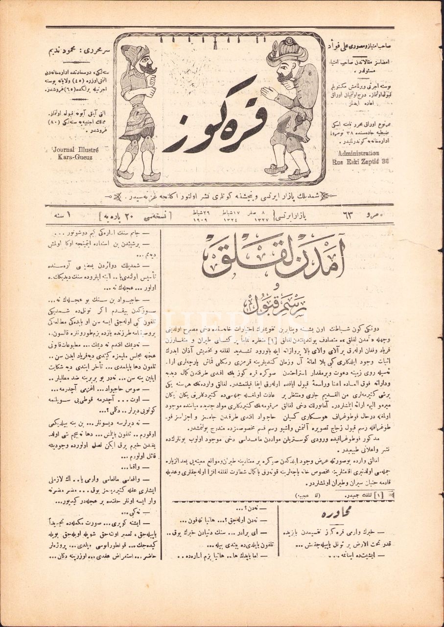 Osmanlıca Karagöz gazetesi, 29 Şubat 1909, 63. sayı, 4 syf., 27x38 cm, kenarları haliyle