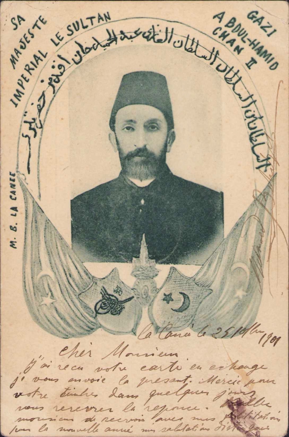Gazi II. Abdülhamit Han portreli, Türk bayrağı detaylı, 1901 tarihli, Osmanlıca - Fransızca yazılı, postadan geçmiş pullu damgalı