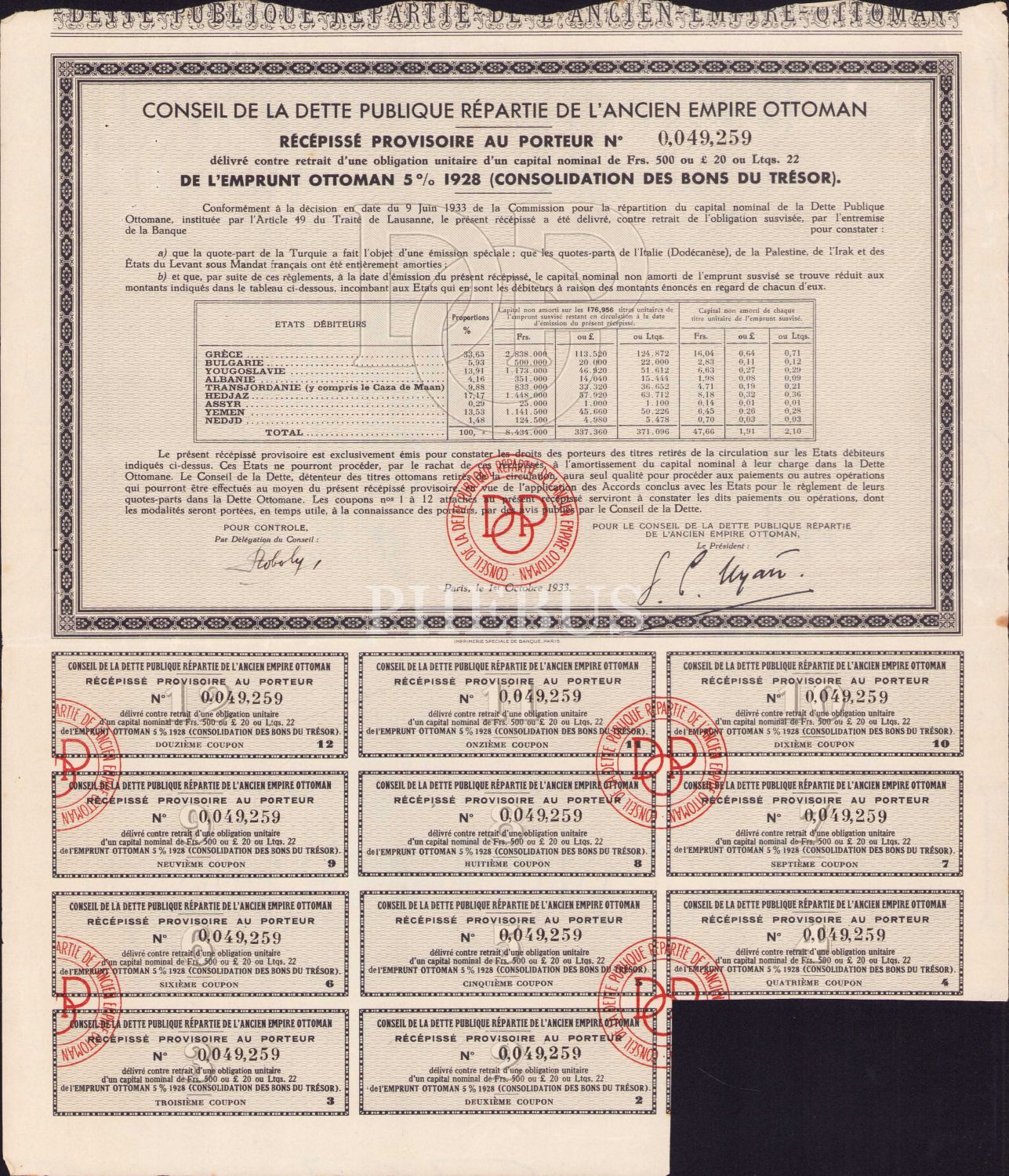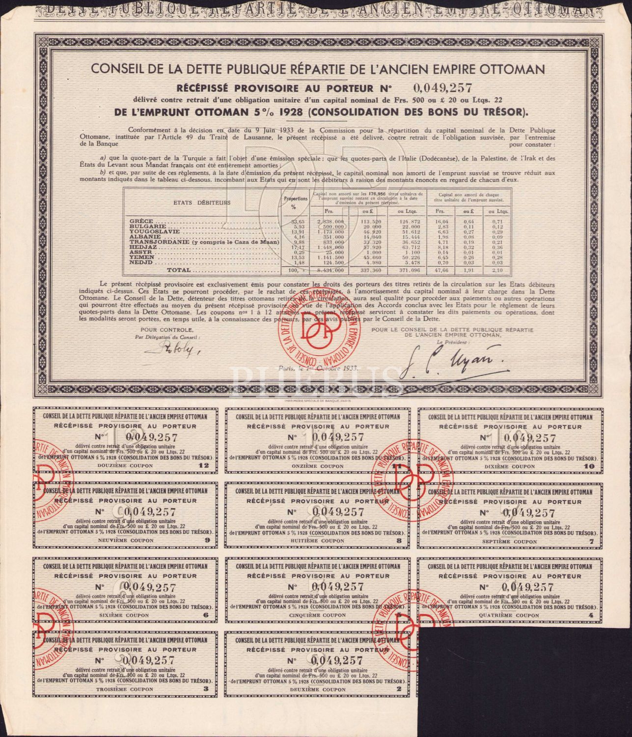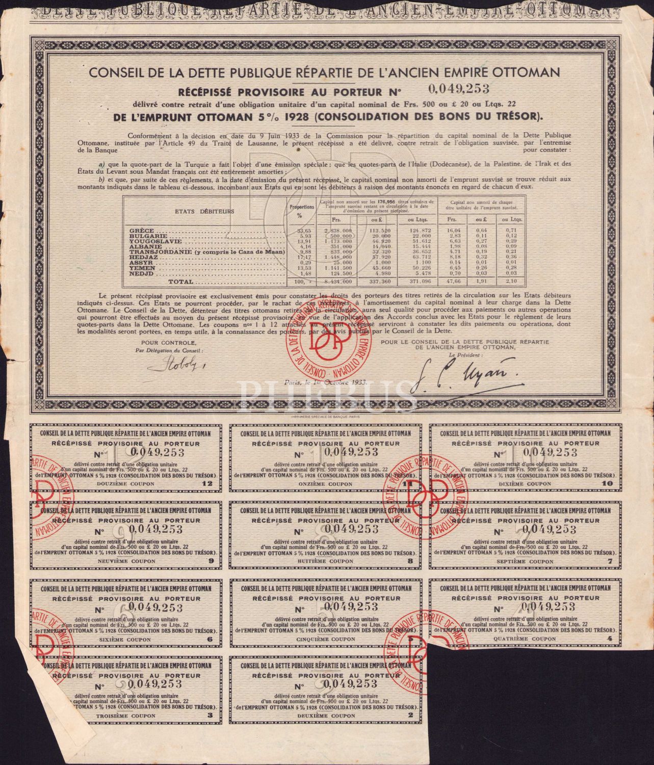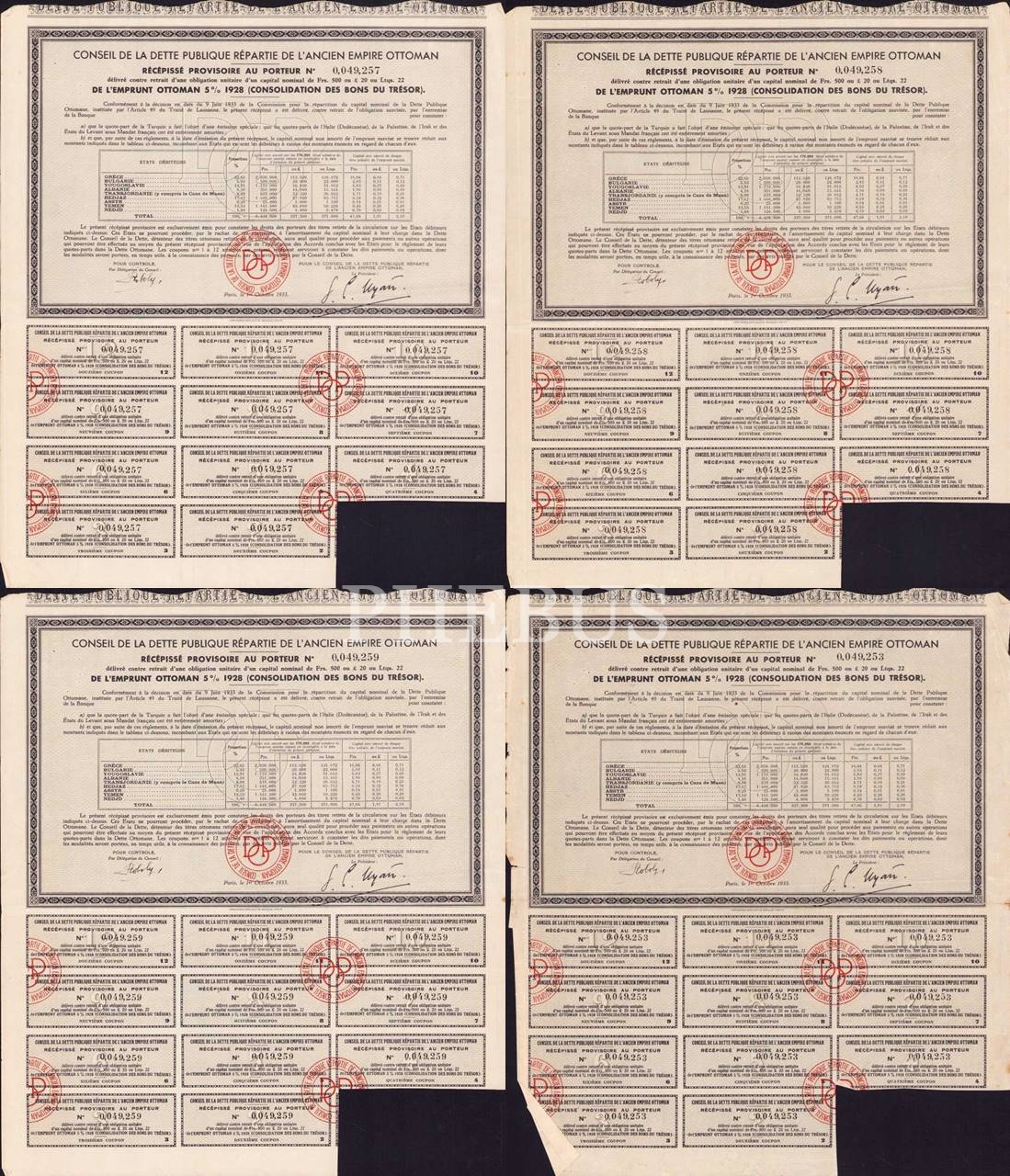 Osmanlı Dönemi Fransızca Hisse Senedi, 1928, 4 adet, 27x32 cm