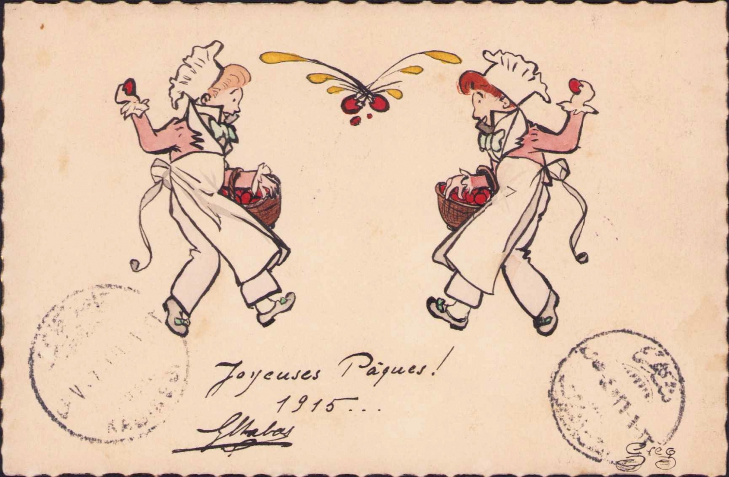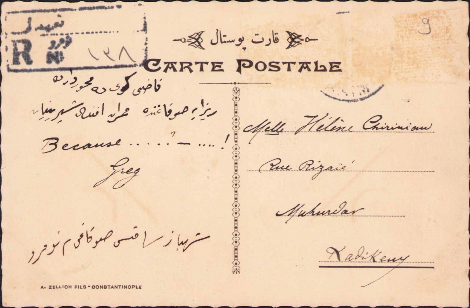 El yapımı Zellich Biraderler nadir kartpostal, suluboya çizim, taahhütlü postadan geçmiş, Kadıköy damgalı