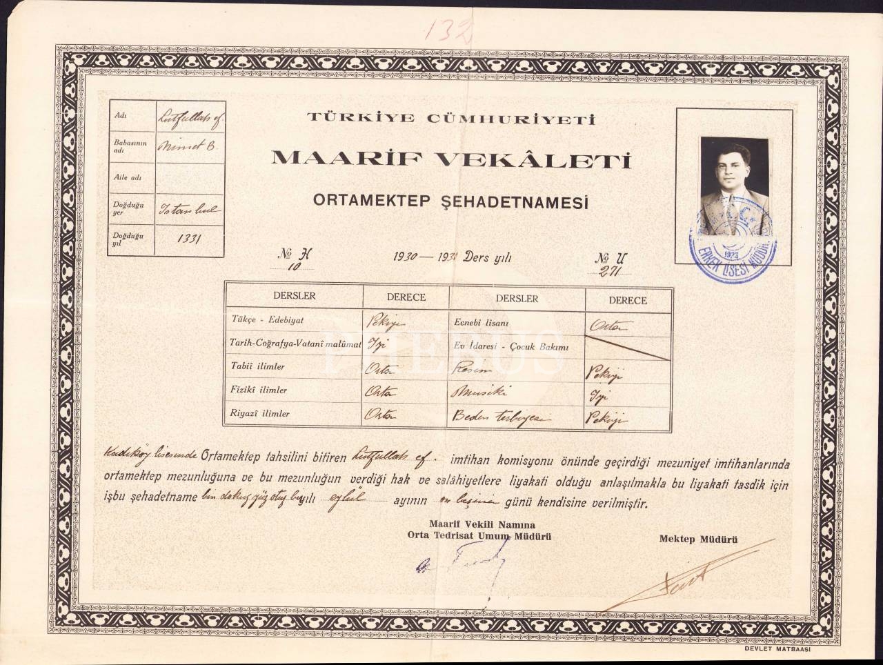 Ortamektep Şehadetnamesi, 1930-1931 ders yılı, 35x27 cm