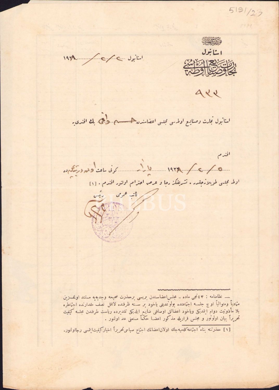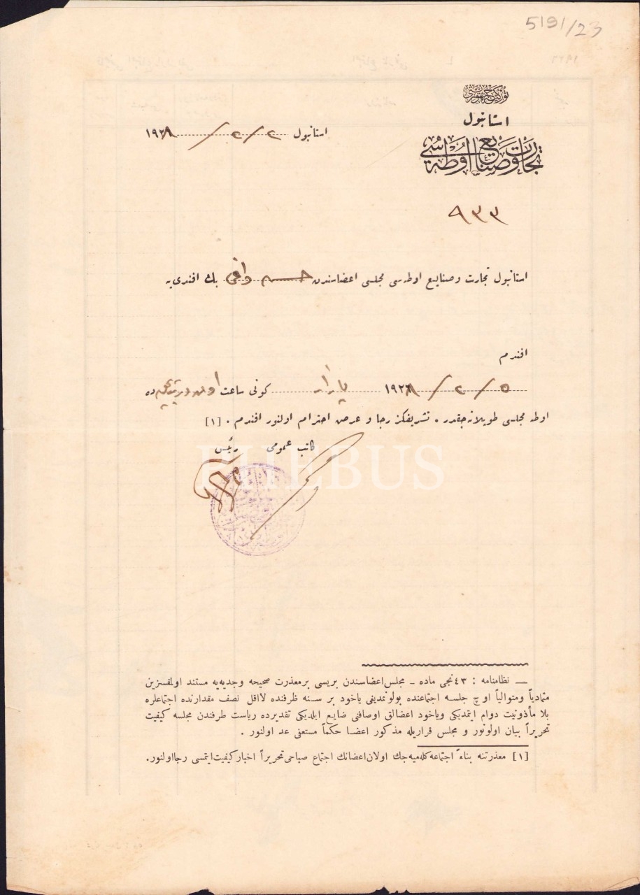 İstanbul Ticaret ve Sanayi Odası antetli toplantı daveti, 1928 tarihli, 21x29 cm