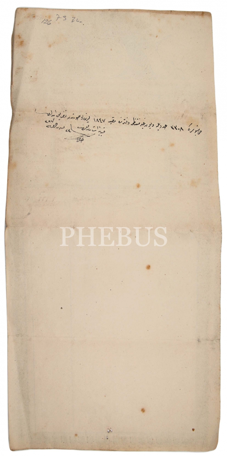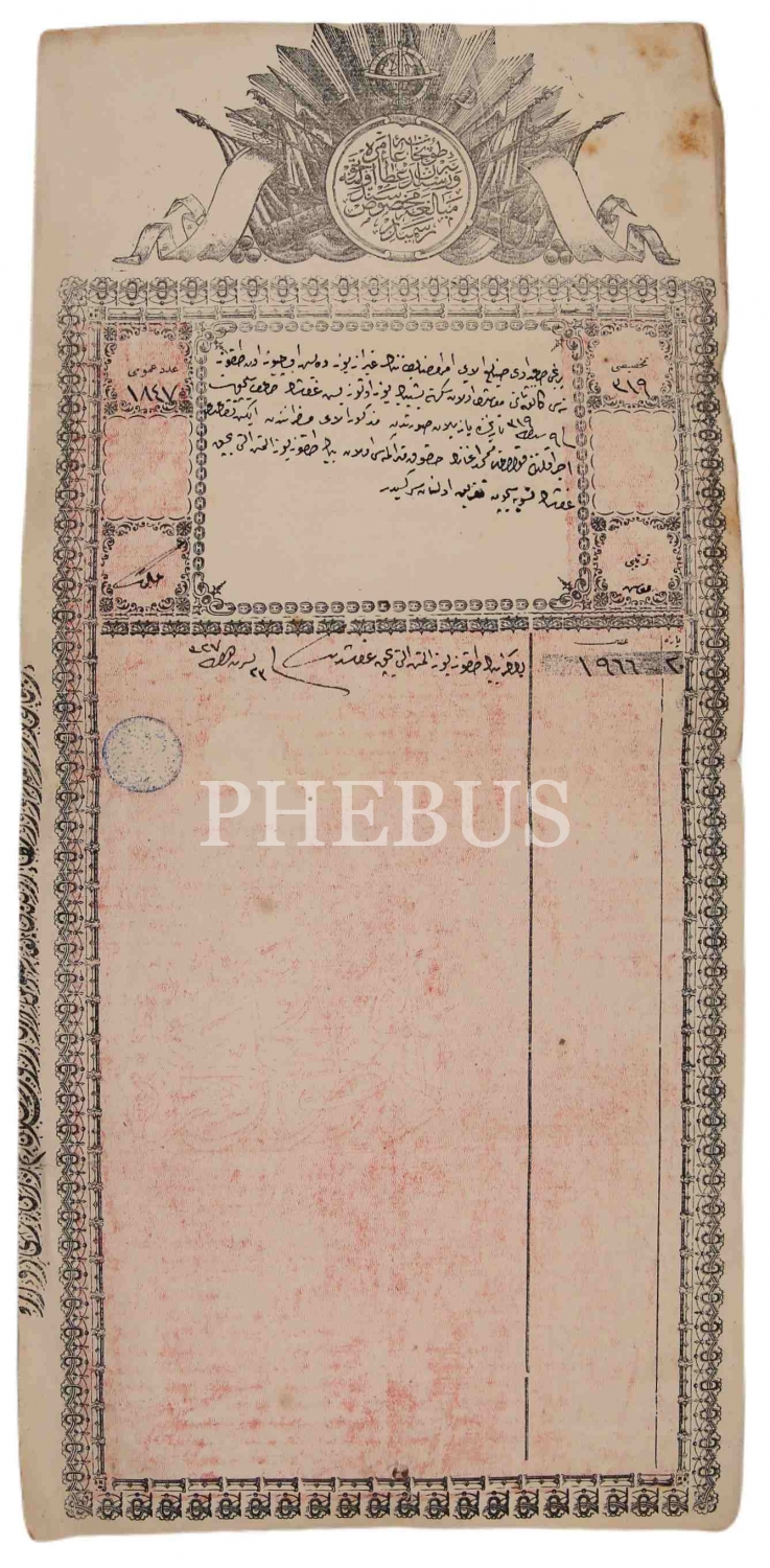 Osmanlıca Tophâne-i Âmire Veznesinden İtâ Olunacak Mebâlige Mahsus Sened-i Resmîdir antetli senet, 1327, 21x46 cm