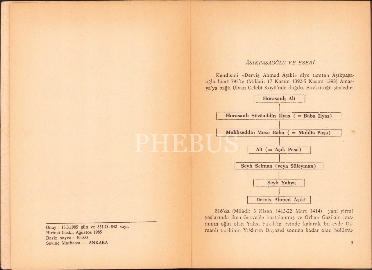 Aşıkpaşaoğlu Tarihi, A. Nihal Atsız, Kültür ve Turizm Bakanlığı Yayınları, Ağustos 1985, 206 sayfa, 14x20 cm