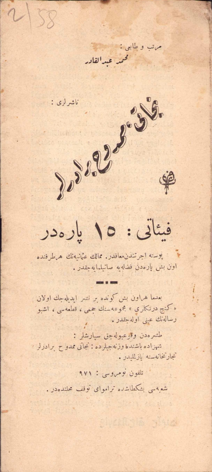 Osmanlı Genç Dernekleri, Evkaf-ı İslamiye Matbaası, 1334, Mehmet Abdülkadir, yazılış amacı bu derneklerin ehemmiyeti ve amacı nedir? Ne suretle çalışılacaktır? sorularına cevap vermektedir. Osmanlıca, kapak Türk bayrağı detaylı, 30 sayfa, 10x23cm