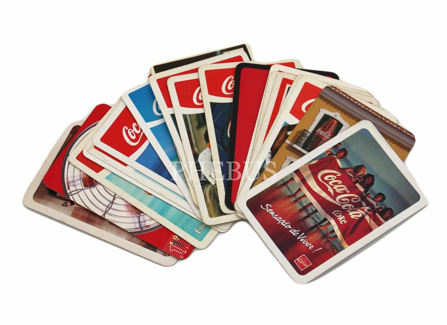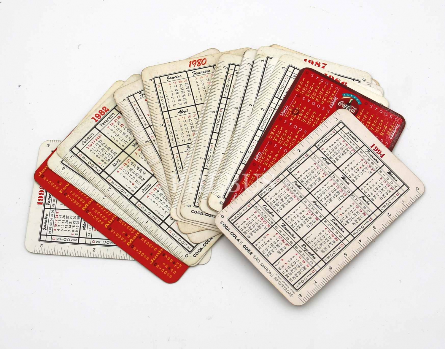 Coca-Cola reklamlı, muhtelif tarihlere ait (1980'ler ve 90'lar) iskambil kağıdı boyutunda cep takvimi, 6x9 cm