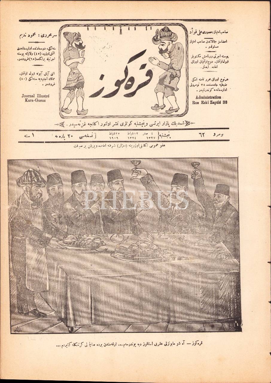 Osmanlıca Karagöz gazetesi, 62. sayı, 25 Şubat 1909, Karagöz - Ah şu mayonezli akrebi ıstakoz diye yutdursam... Arkasından bir de salçalı kertenkele getirdim...", 4 syf., 27x38 cm