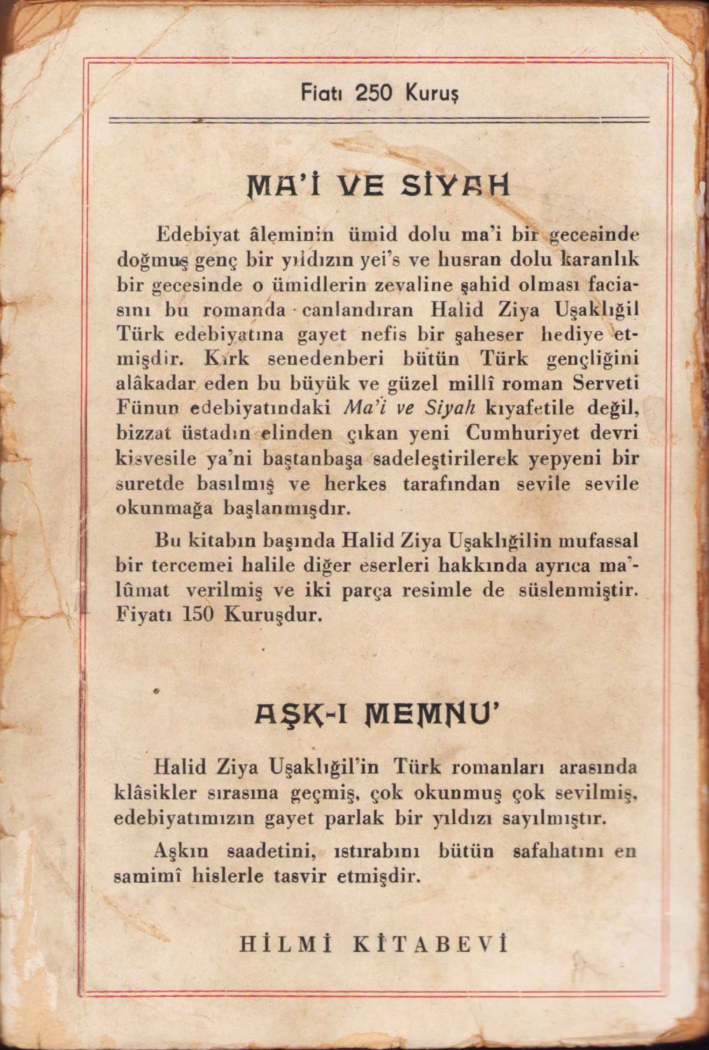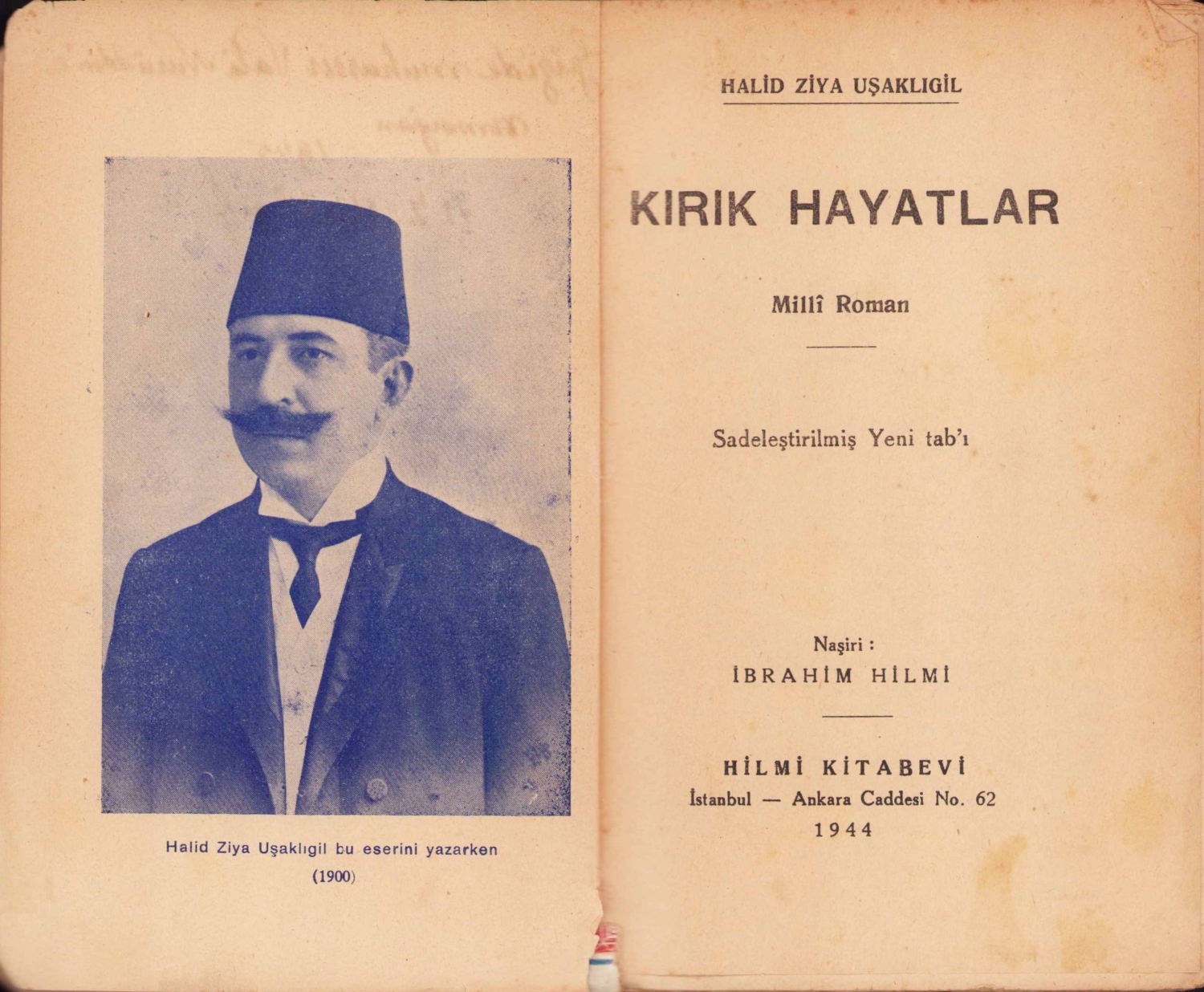Kırık Hayatlar - Milli Roman, Halid Ziya Uşaklıgil, sadeleştirilmiş yeni baskı, İstanbul, 1944, Vâlâ Nureddin'e ithaflı imzalı, bir kenarı kopuk, 475 sayfa, 13x19cm