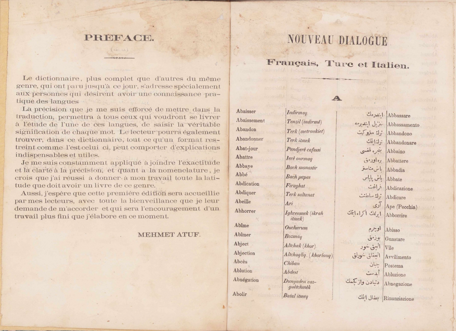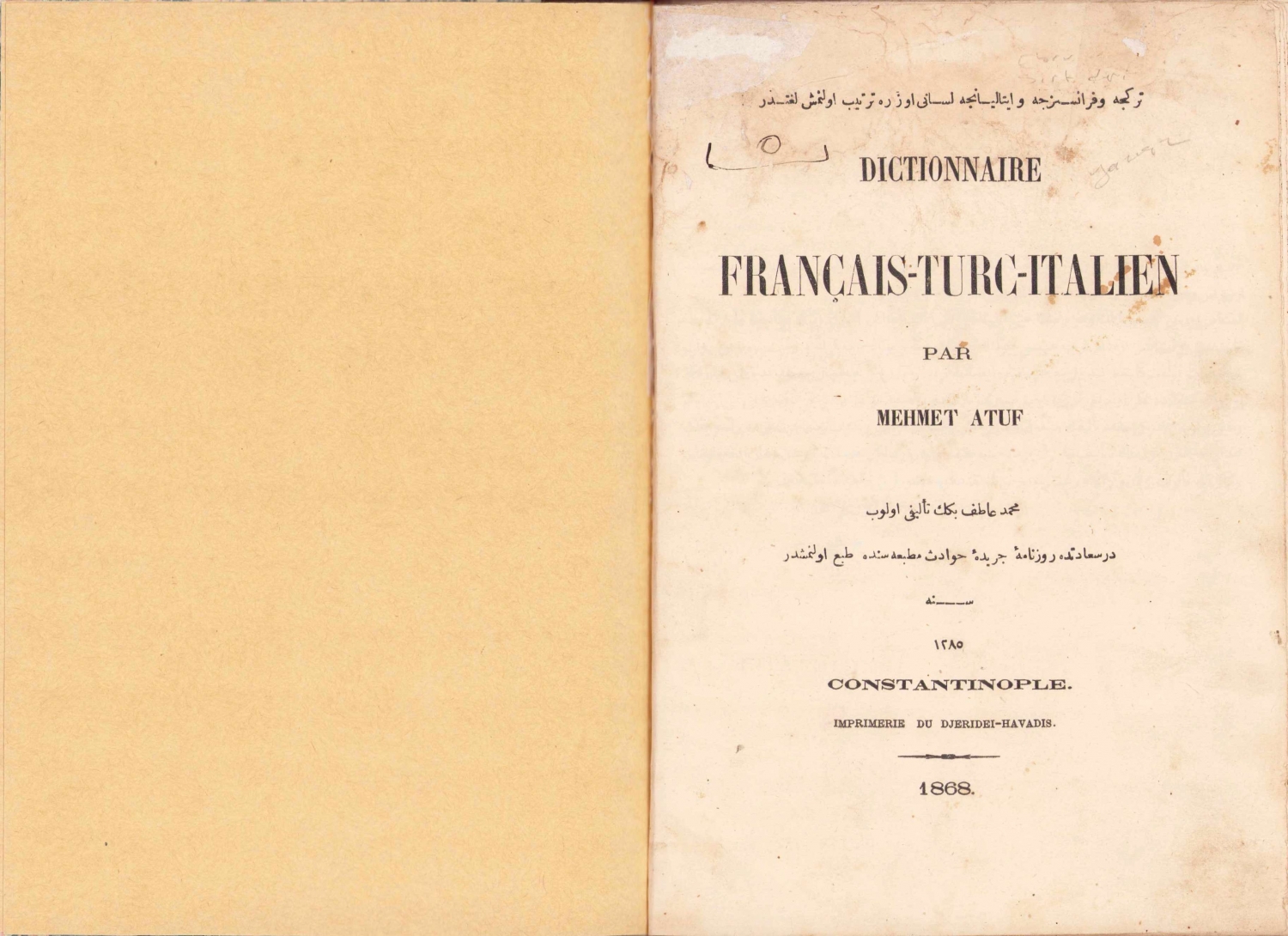 Türkçe ve Fransızca ve İtalyanca Lisanı Üzerine Tertib Olunmus Lugattır - Dictionnaire Français - Turc - İtalien, Mehmet Atuf, Constantinople, 1868, deri ve ebru ciltli, 407 sayfa, 18x25cm