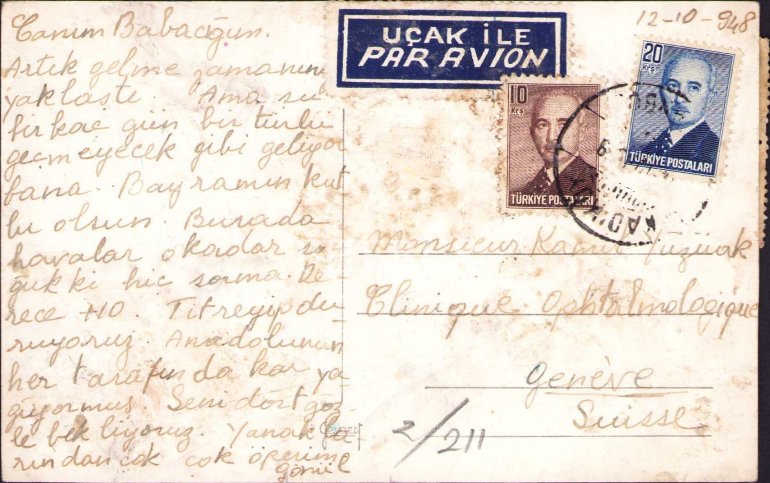 Kadıköy İskelesi, Cenevre'den Kadıköy'e gönderilmiş, pullu - damgalı, yorgun