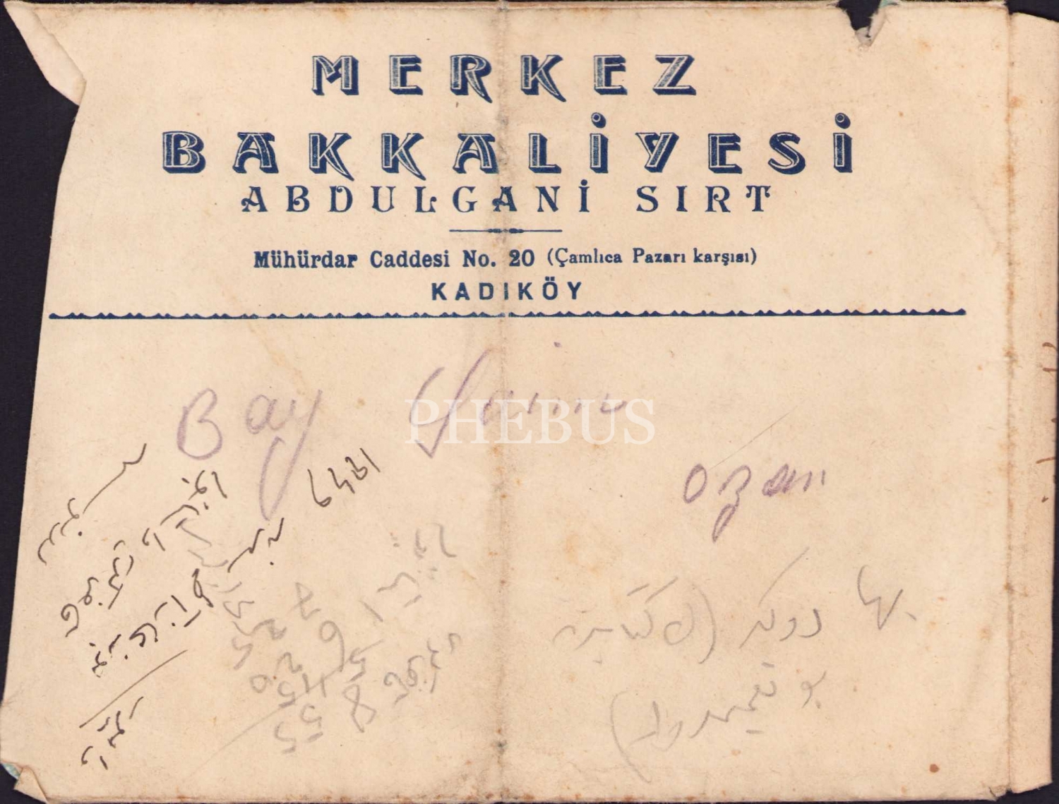 Merkez Bakkaliyesi Kadıköy antetli zarf, ön yüzünde Osmanlıca yazılı,12x16 cm, haliyle