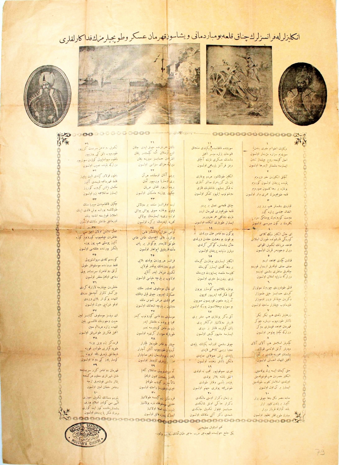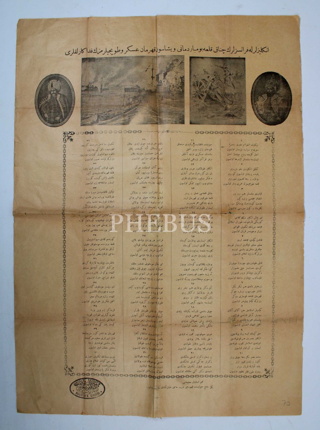 Necmi İstikbal Matbaası, Mustafa Şükrü damgalı, top, asker, savaş gemisi görselli, tamirli, 40x56cm. Mustafa Şükrü Efendi (1851 - 23 Ekim 1924), son dönem Osmanlı ulemasından, müderris ve Huzur Dersleri muharriridir. Gazeteci, yazar ve siyaset adamı, Türkiye başbakanlarından, CHP ve DSP Genel Başkanı Bülent Ecevit'in dedesidir.