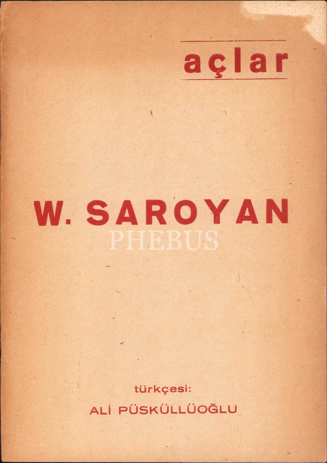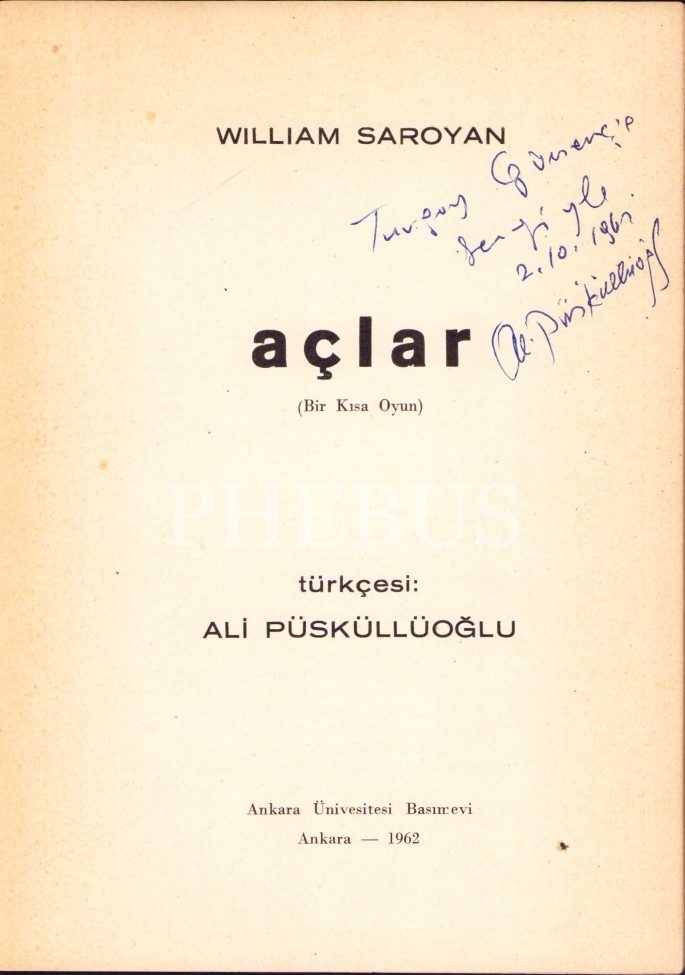 Açlar, William Saroyan, Çev. Ali Püsküllüoğlu, Ankara Üni. Basımevi, Ankara 1962, ithaflı ve imzalı, 23 syf., 14x19 cm, kapak üst köşe yırtık