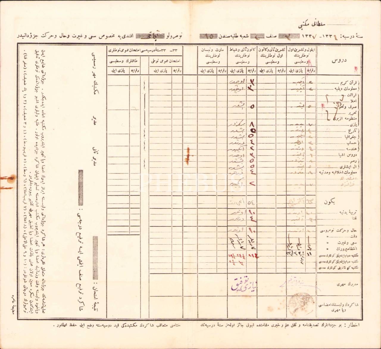 Osmanlıca öğrenci karnesi, Kadıköy Sultanisi, 1336-37 eğitim-öğretim döneminden, 21x24 cm