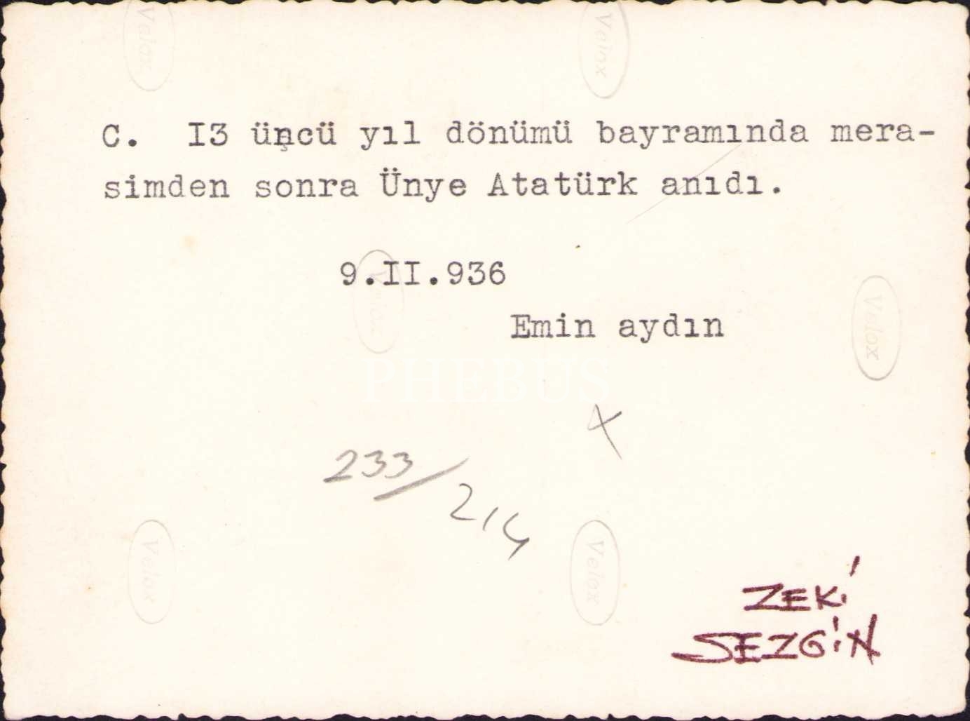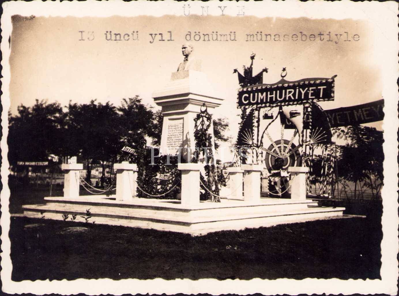 Cumhuriyet'in "13 üncü yıl dönümü münasebetiyle" yazılı Ünye Atatürk Anıtı, 1936, 9x12 cm