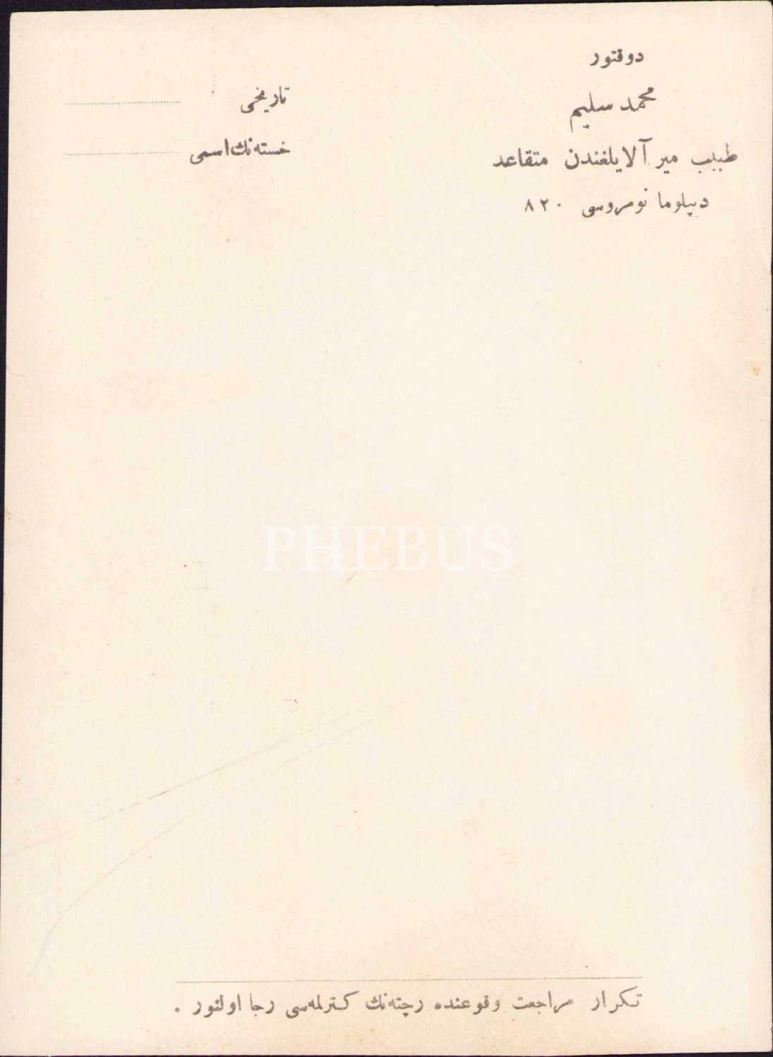 Osmanlıca Doktor Mehmed Selim antetli boş reçete kağıdı, 12x16 cm